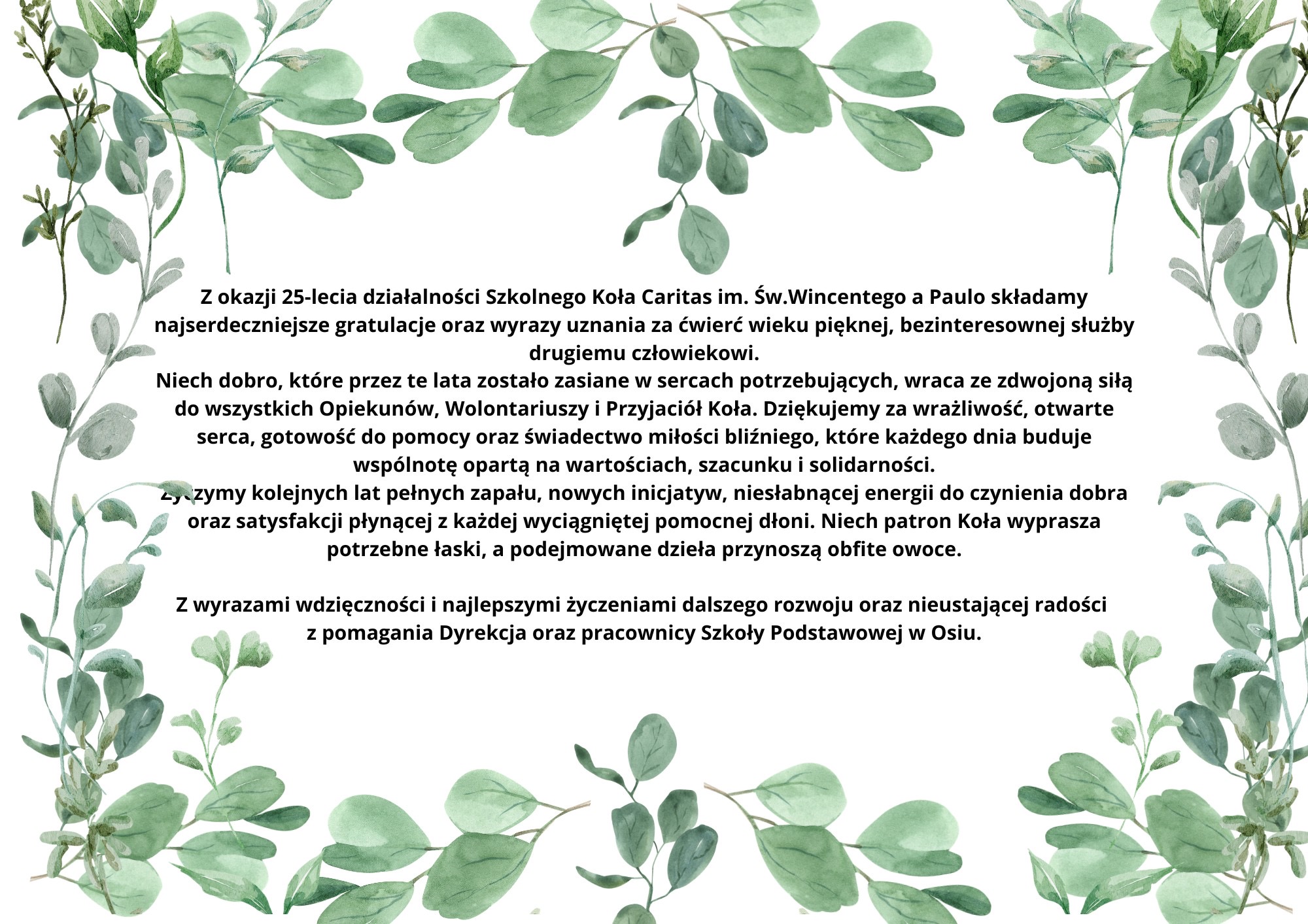 Caritas działający przy Szkole Podstawowej w Osiu obchodzi w tym roku 25-lecie swojej działalności. Od ćwierć wieku uczniowie, nauczyciele i wolontariusze angażują się w pomoc potrzebującym, ucząc się wrażliwości, odpowiedzialności i realnego działania na rzecz innych.