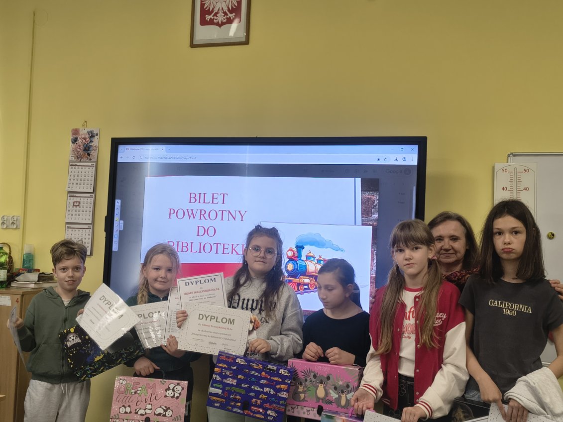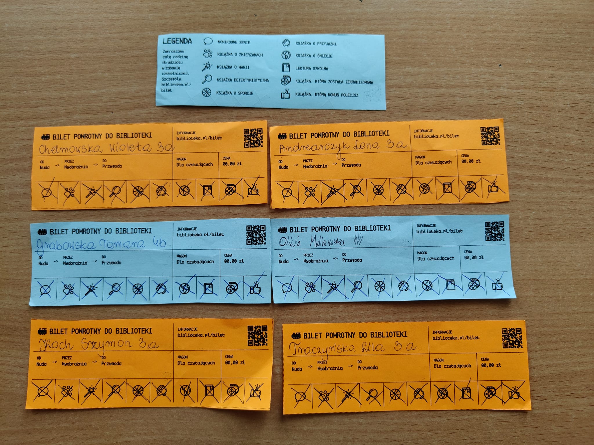 Zakończyła się akcja „Bilet powrotny do biblioteki”. Pasażerowie - chętni uczniowie z klasy 3a i klas czwartych wyruszyli w czytelniczą podróż tylko i wyłącznie z biletem, który znajdował się w kasie : „Biblioteka szkolna”. Zawierał on ikonki ilustrujące kategorie książek oraz legendę np. łapka – książka o zwierzakach. Zabawa polegała na czytaniu książek zgodnie z kategoriami napisanymi na bilecie.