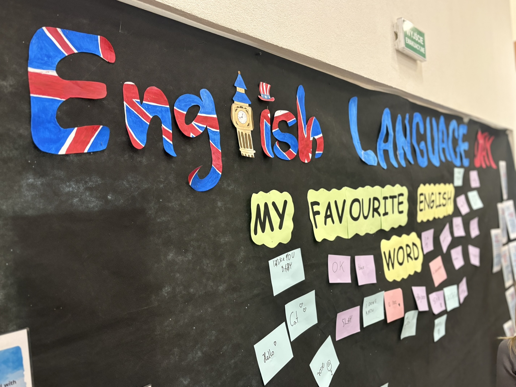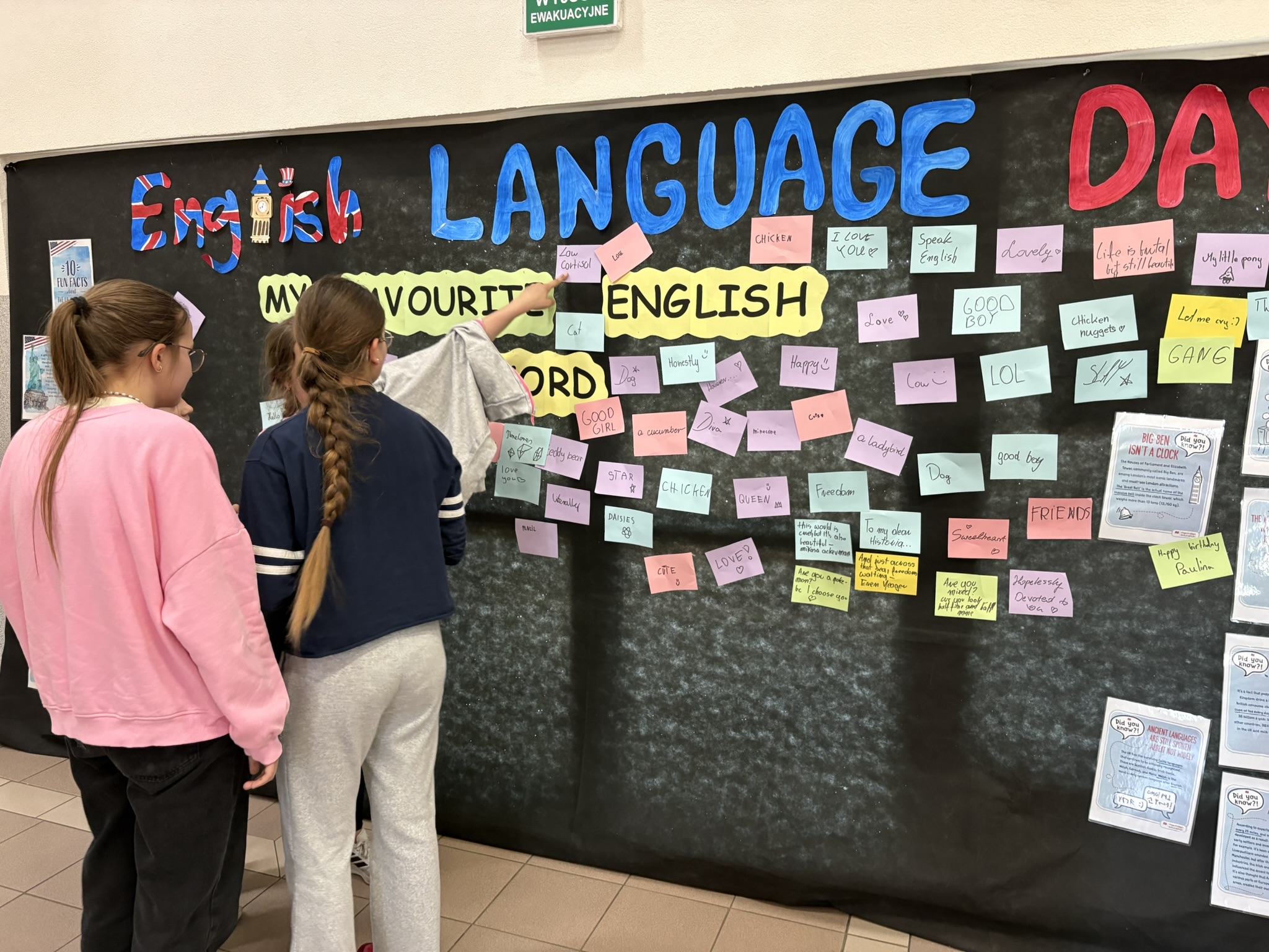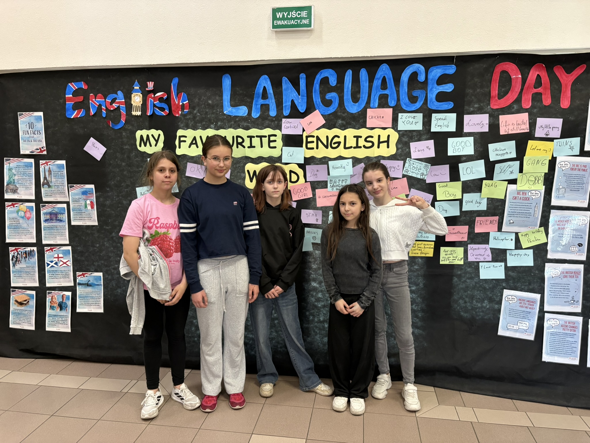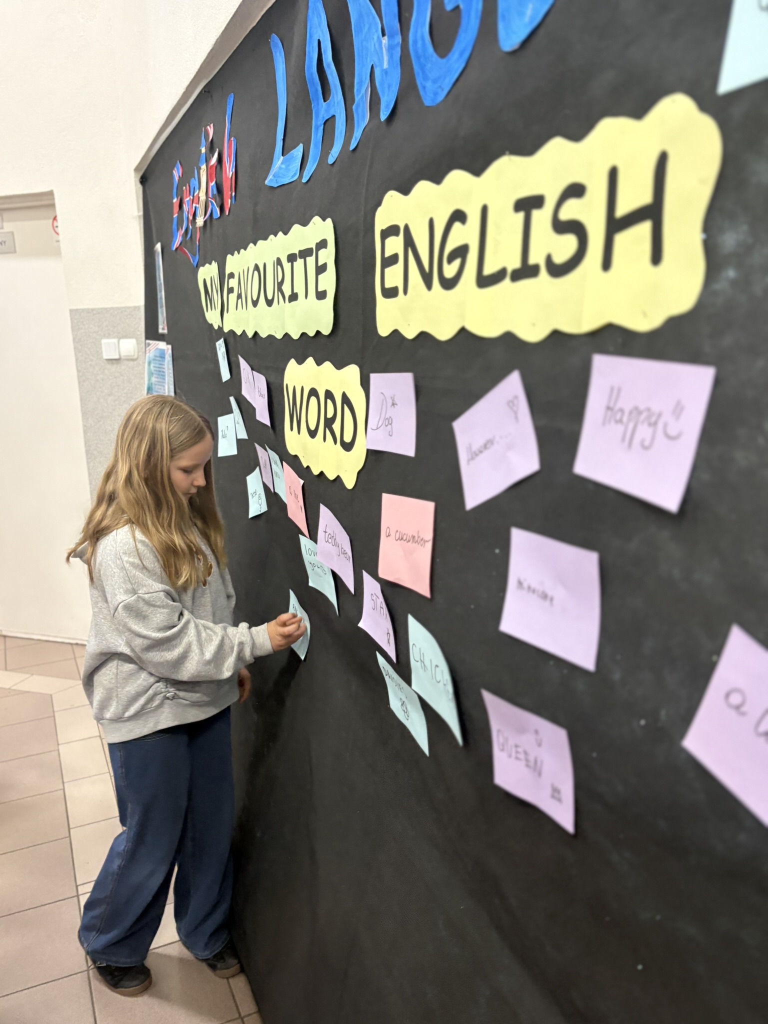 Podczas przerw na korytarzach rozbrzmiewała muzyka anglojęzyczna, wprowadzając wszystkich w wyjątkowy klimat. Jedną z ulubionych aktywności było dzielenie się swoim ulubionym słowem w języku angielskim – uczniowie zapisywali je i przyklejali w specjalnie przygotowanym miejscu, tworząc barwną i inspirującą przestrzeń.