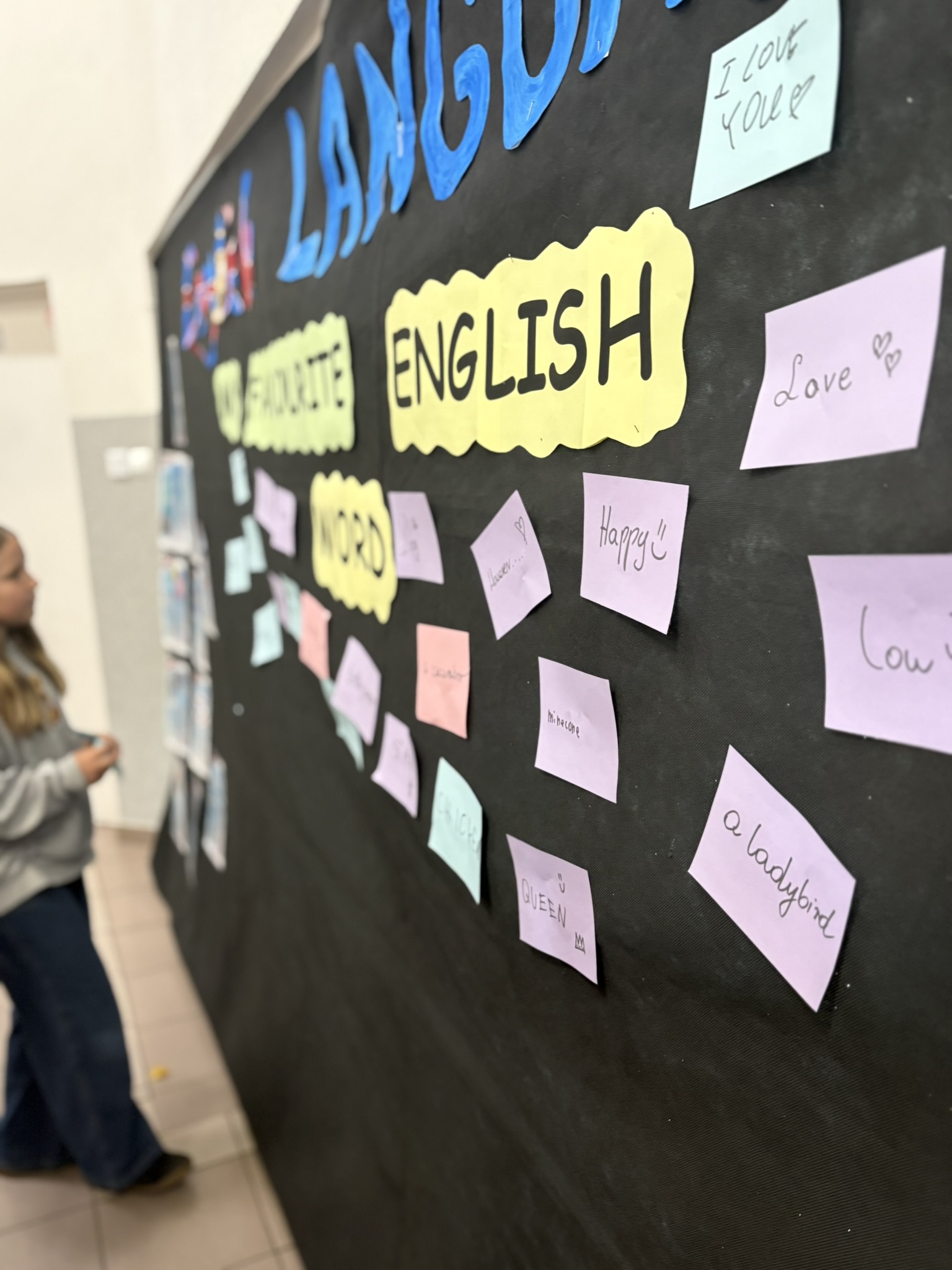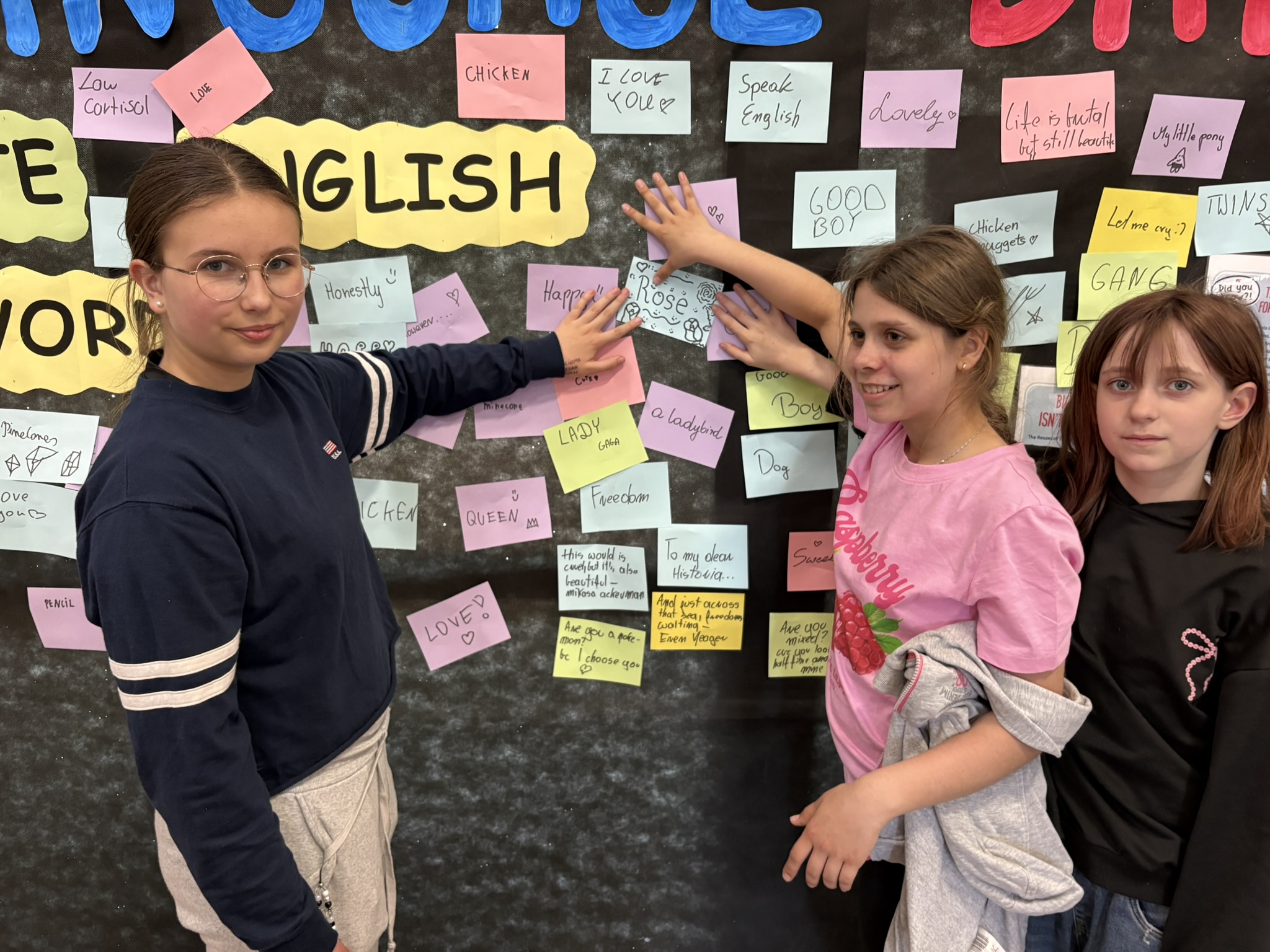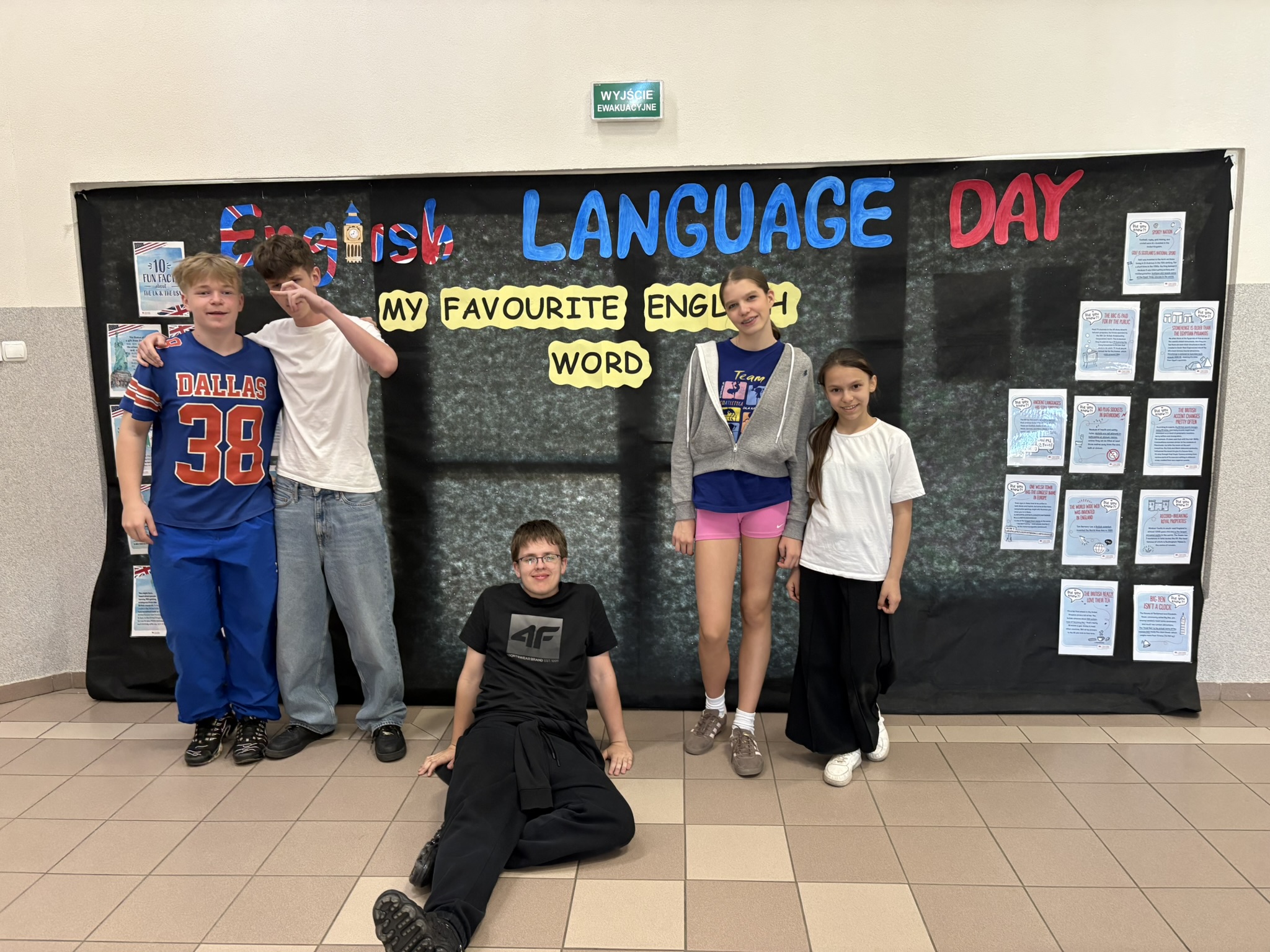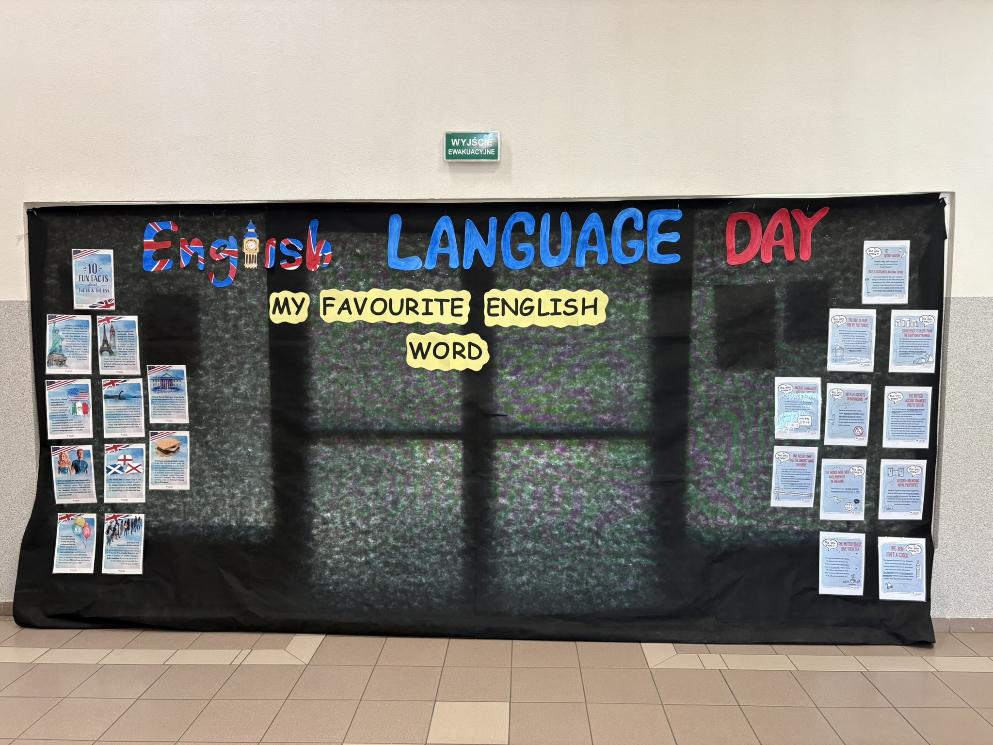 Podczas przerw na korytarzach rozbrzmiewała muzyka anglojęzyczna, wprowadzając wszystkich w wyjątkowy klimat. Jedną z ulubionych aktywności było dzielenie się swoim ulubionym słowem w języku angielskim – uczniowie zapisywali je i przyklejali w specjalnie przygotowanym miejscu, tworząc barwną i inspirującą przestrzeń.