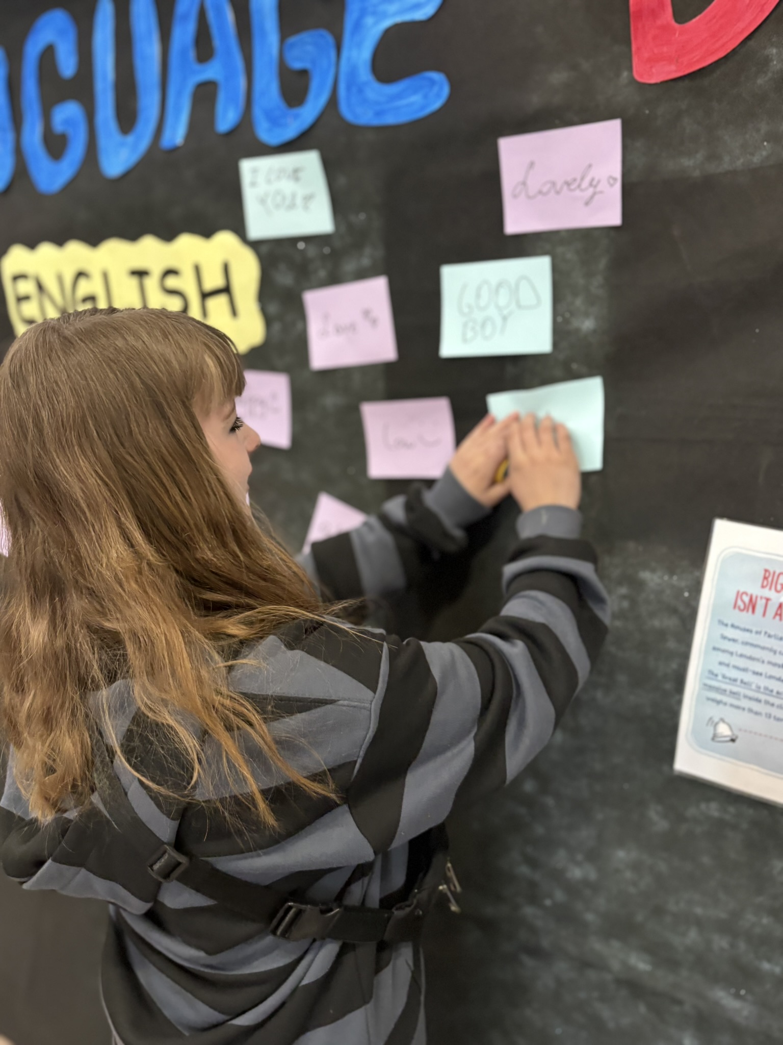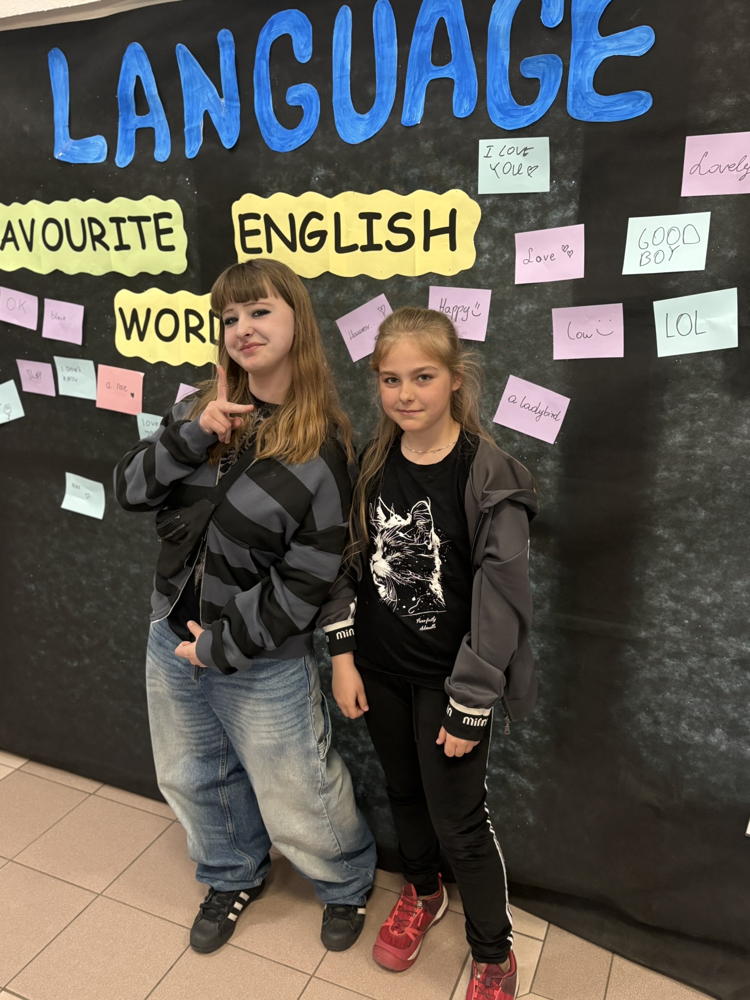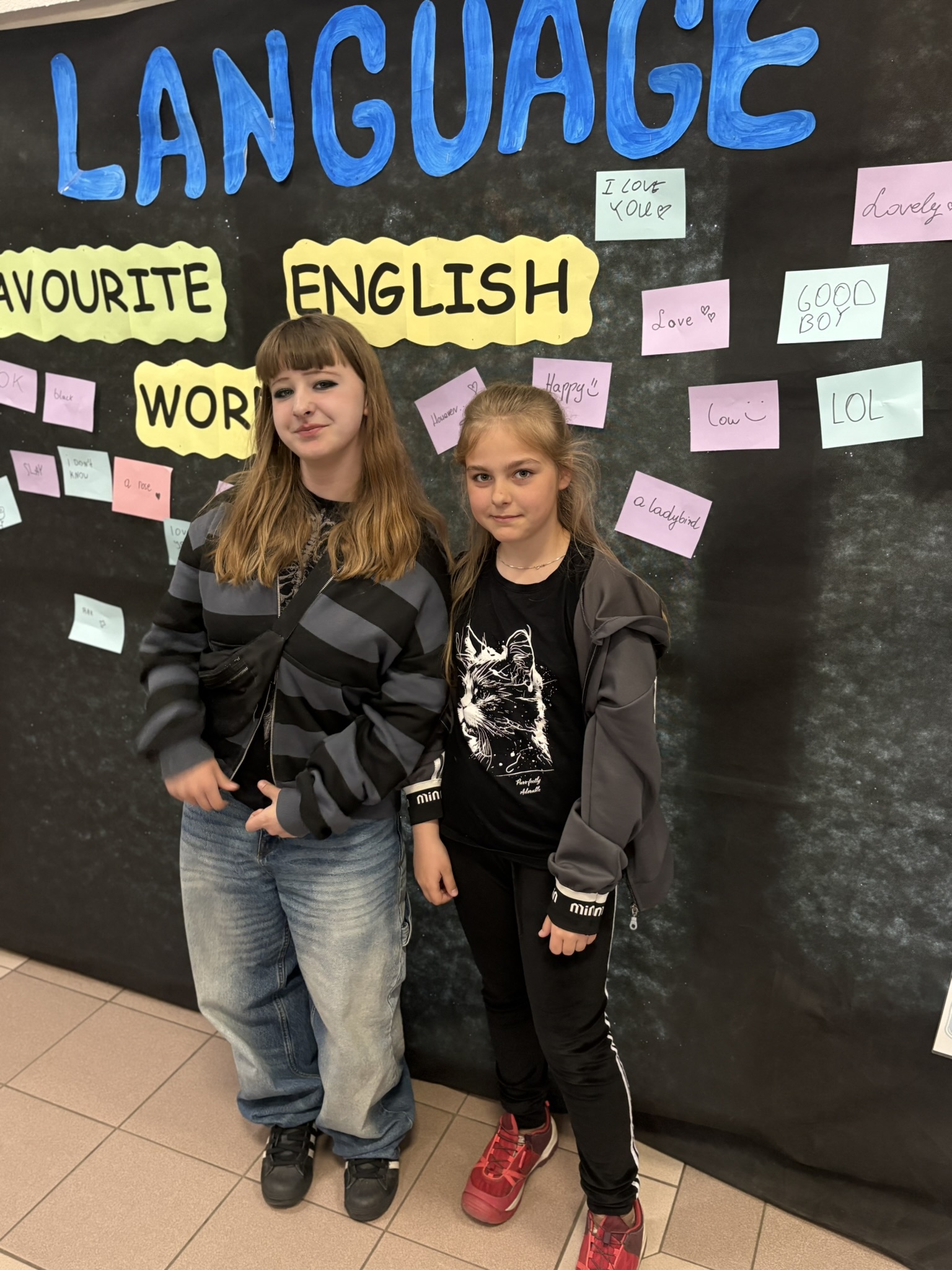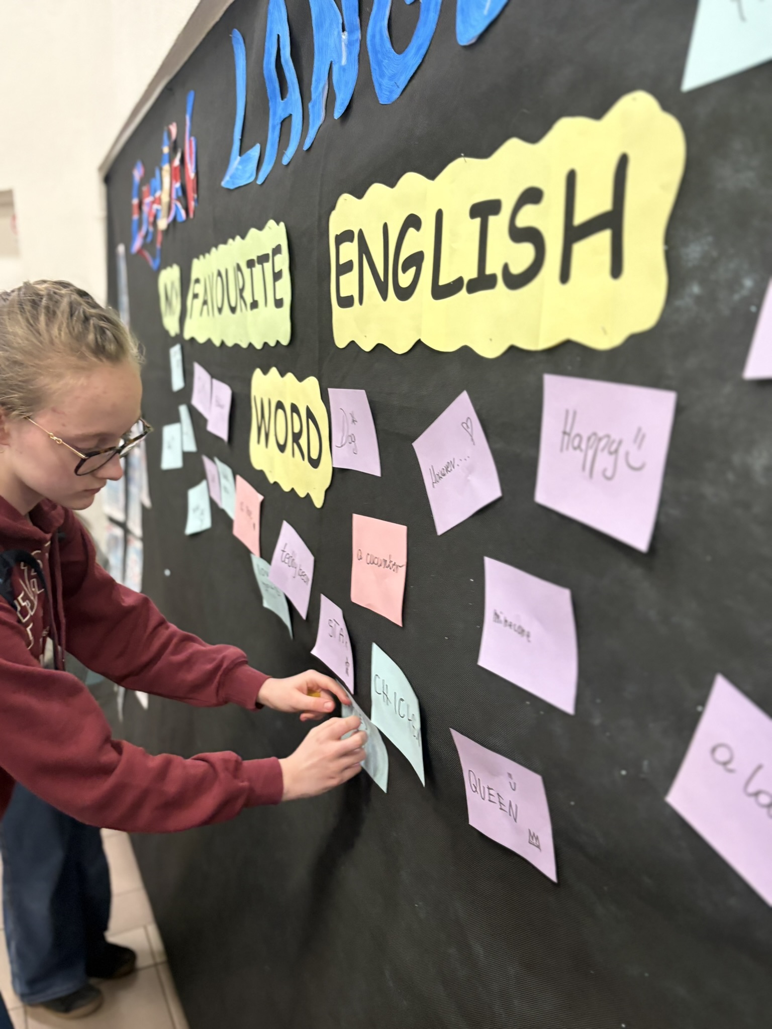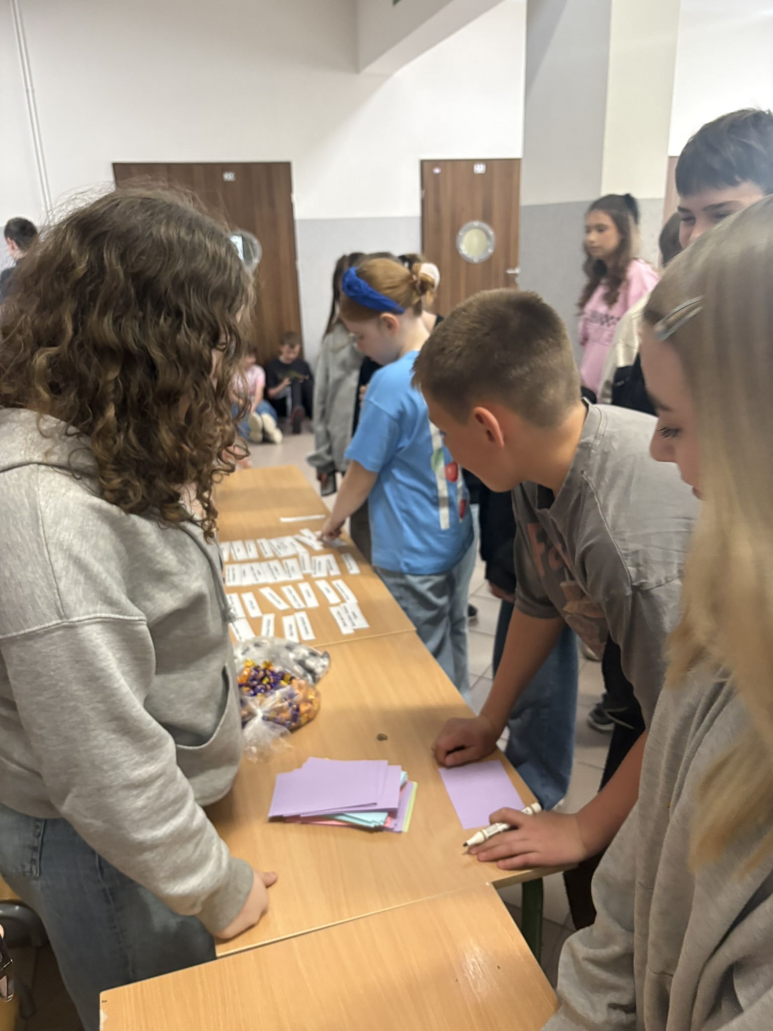 Podczas przerw na korytarzach rozbrzmiewała muzyka anglojęzyczna, wprowadzając wszystkich w wyjątkowy klimat. Jedną z ulubionych aktywności było dzielenie się swoim ulubionym słowem w języku angielskim – uczniowie zapisywali je i przyklejali w specjalnie przygotowanym miejscu, tworząc barwną i inspirującą przestrzeń.