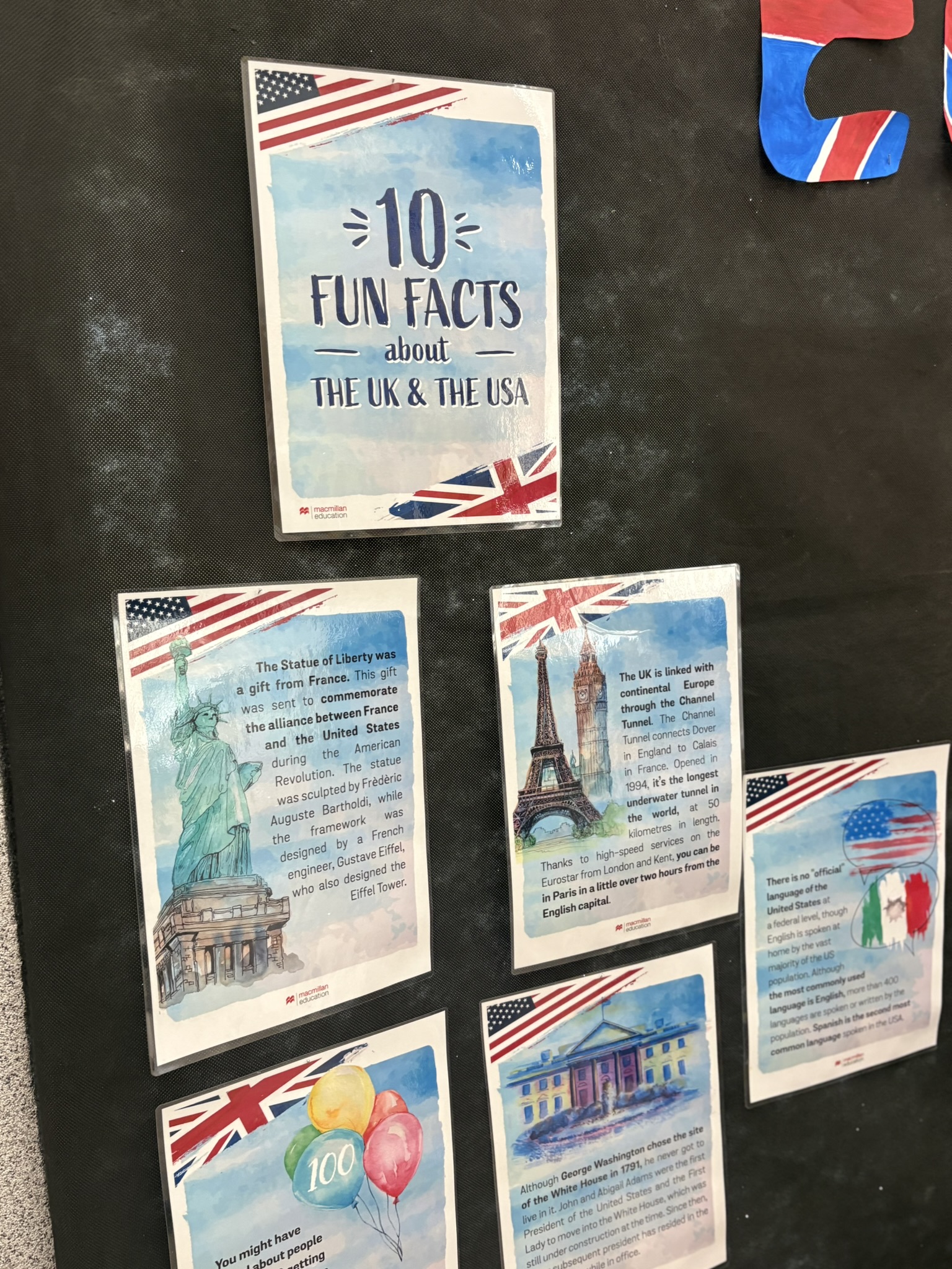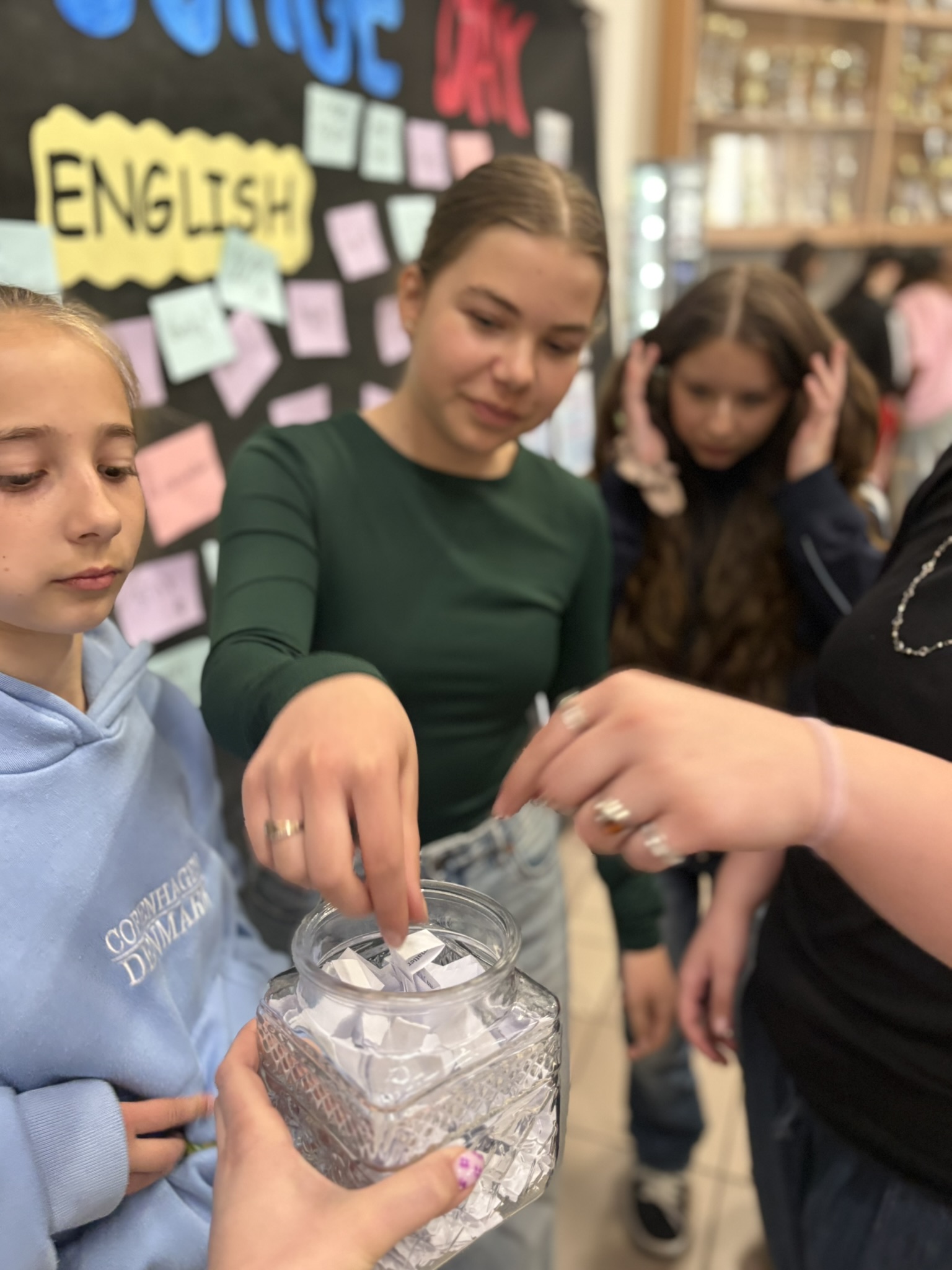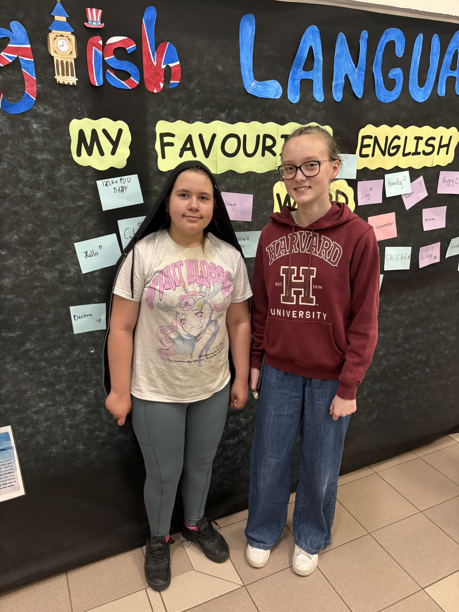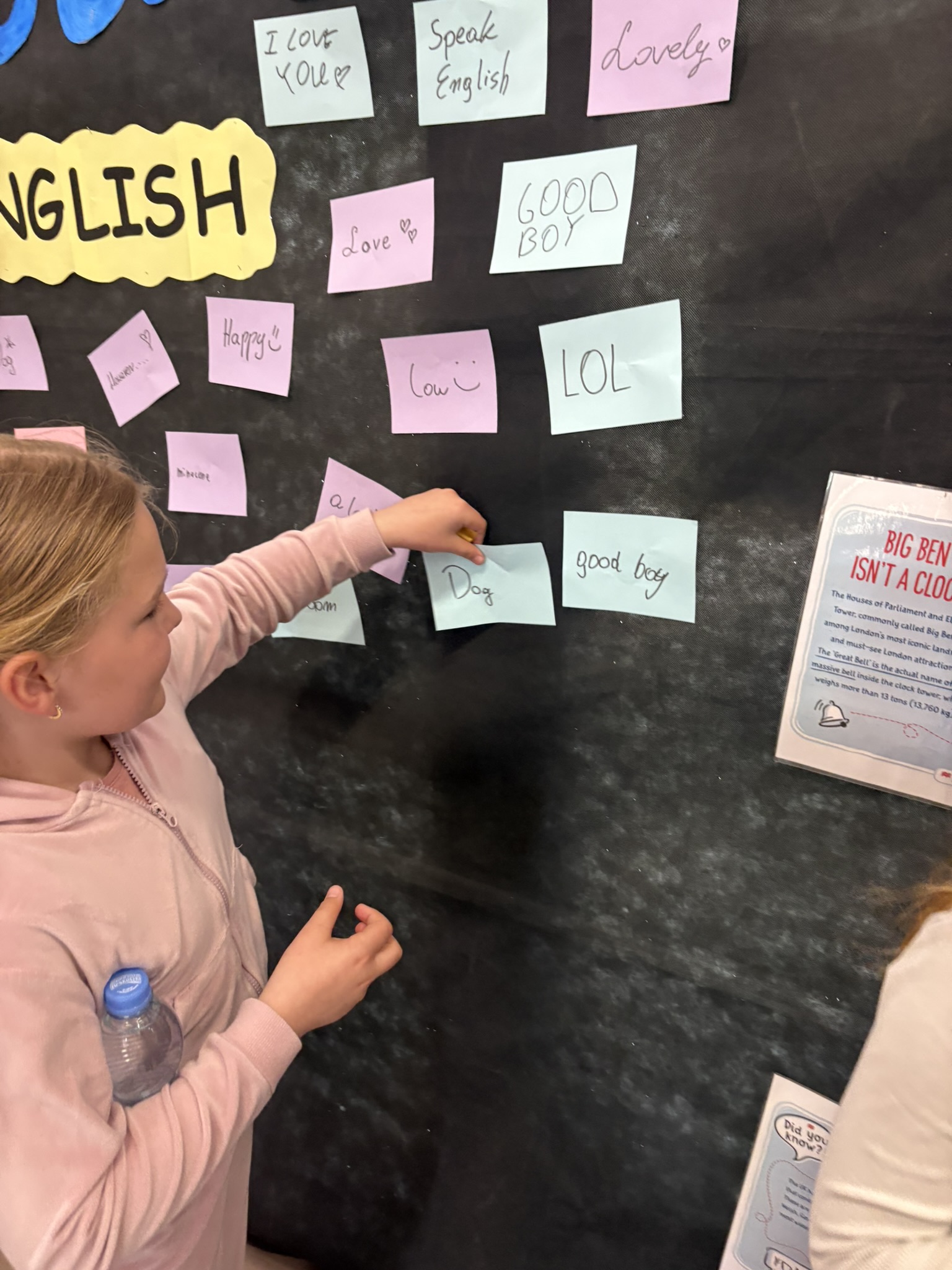 Podczas przerw na korytarzach rozbrzmiewała muzyka anglojęzyczna, wprowadzając wszystkich w wyjątkowy klimat. Jedną z ulubionych aktywności było dzielenie się swoim ulubionym słowem w języku angielskim – uczniowie zapisywali je i przyklejali w specjalnie przygotowanym miejscu, tworząc barwną i inspirującą przestrzeń.