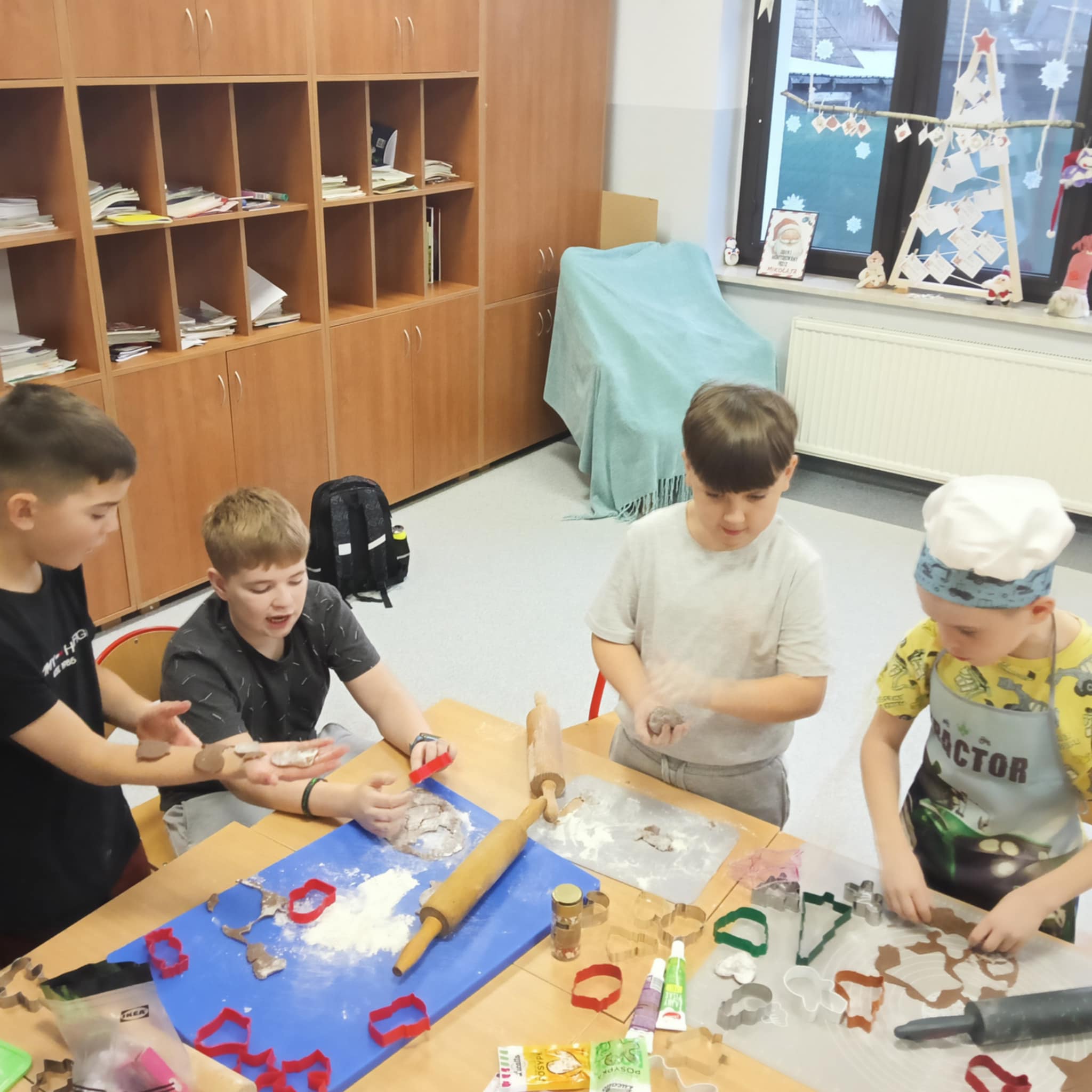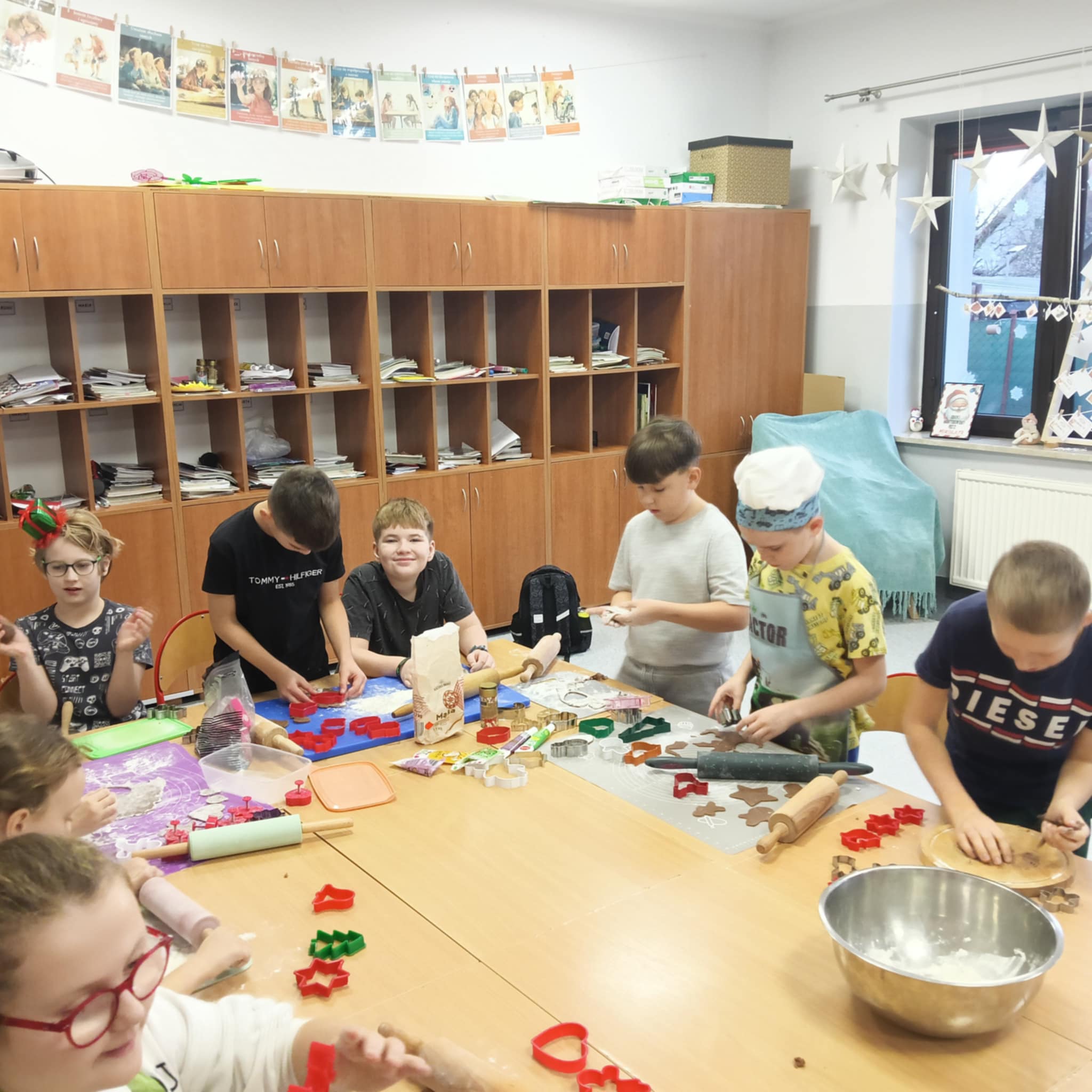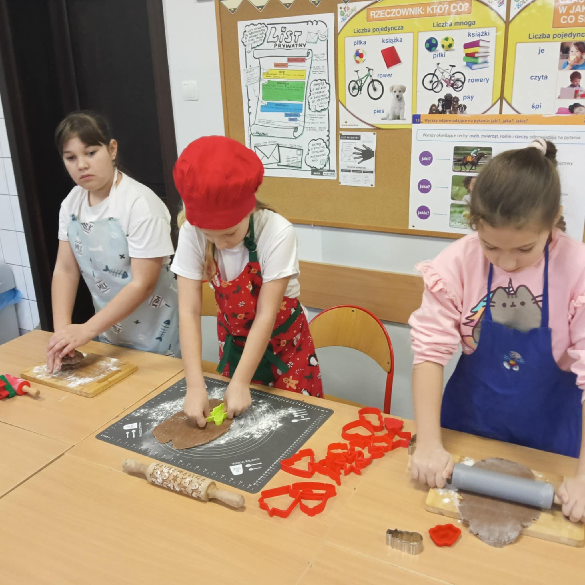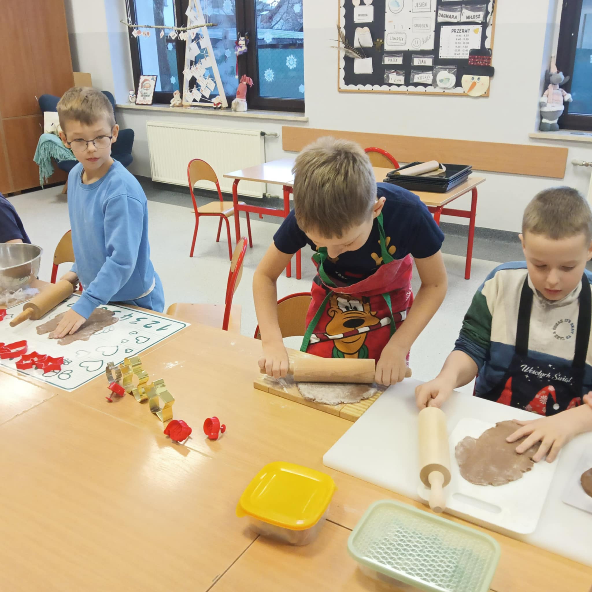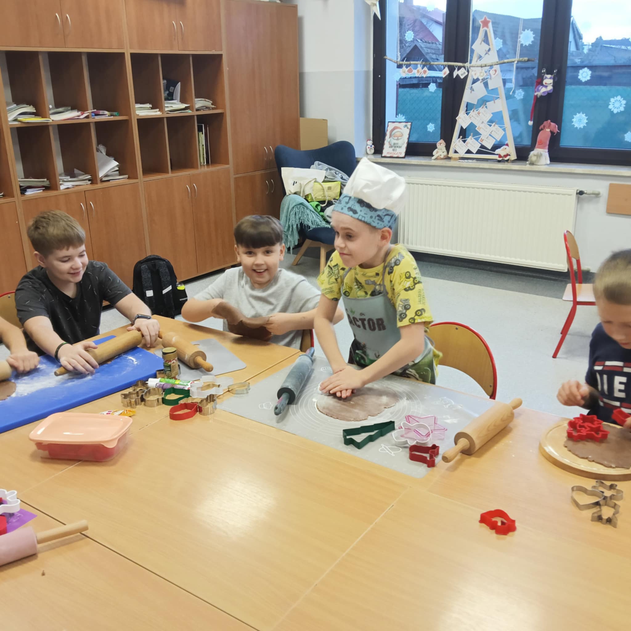 Uczniowie z ogromnym zaangażowaniem wykrawali różnorodne ksztaÅ‚ty ciasteczek, piekli je, a nastÄ™pnie dekorowali kolorowymi lukrami i posypkami. CaÅ‚oÅ›ci towarzyszyÅ‚y Å›wiÄ…teczne melodie, które wprowadziÅ‚y wyjÄ…tkowy nastrój i sprawiÅ‚y, że praca staÅ‚a siÄ™ prawdziwÄ… zabawÄ…. Wspólne przygotowania dostarczyÅ‚y dzieciom wiele radoÅ›ci, byÅ‚y okazjÄ… do wspóÅ‚pracy i integracji, a także pozwoliÅ‚y stworzyć piÄ™kne wspomnienia zwiÄ…zane z magiÄ… Å›wiÄ…t.