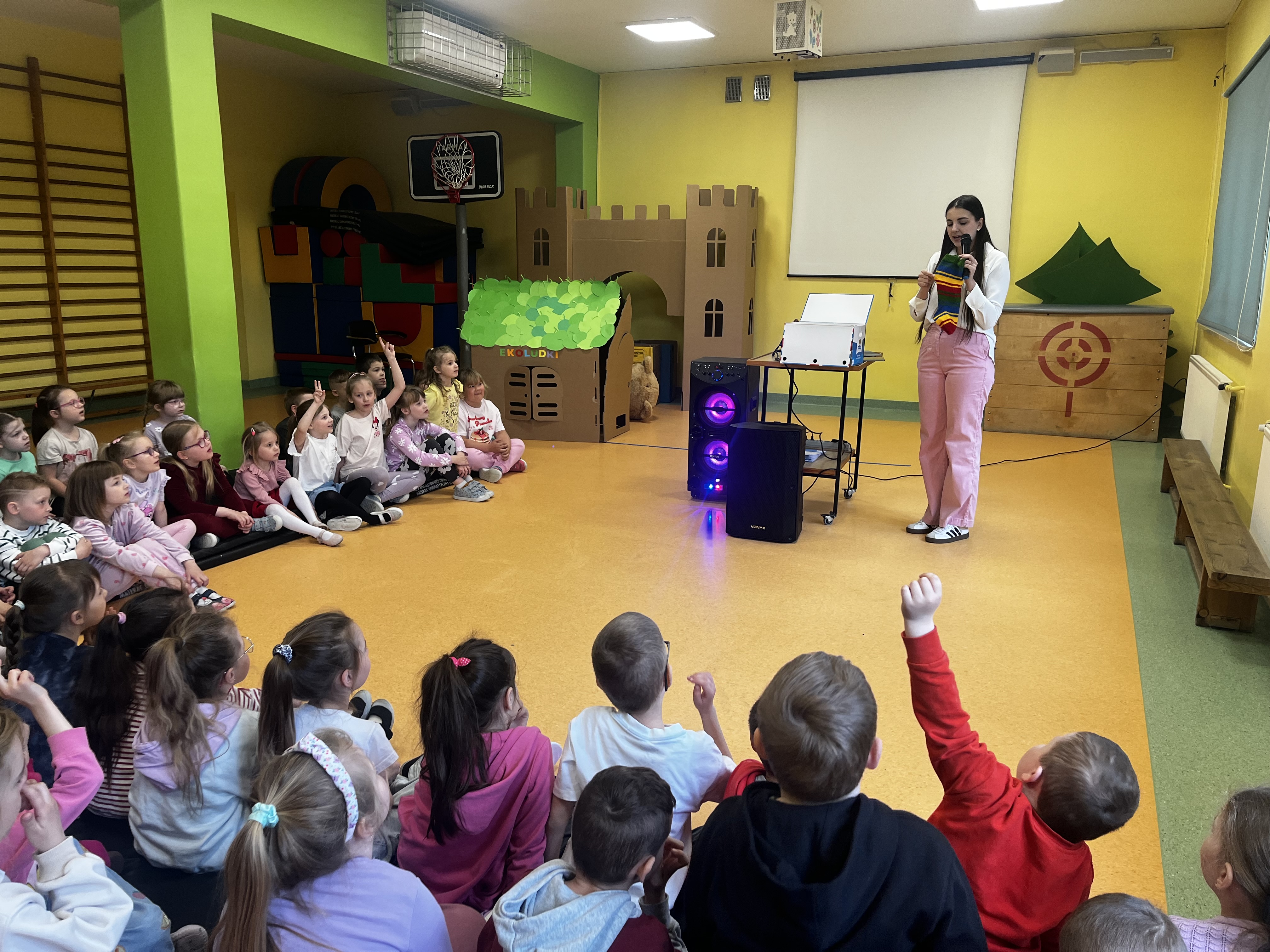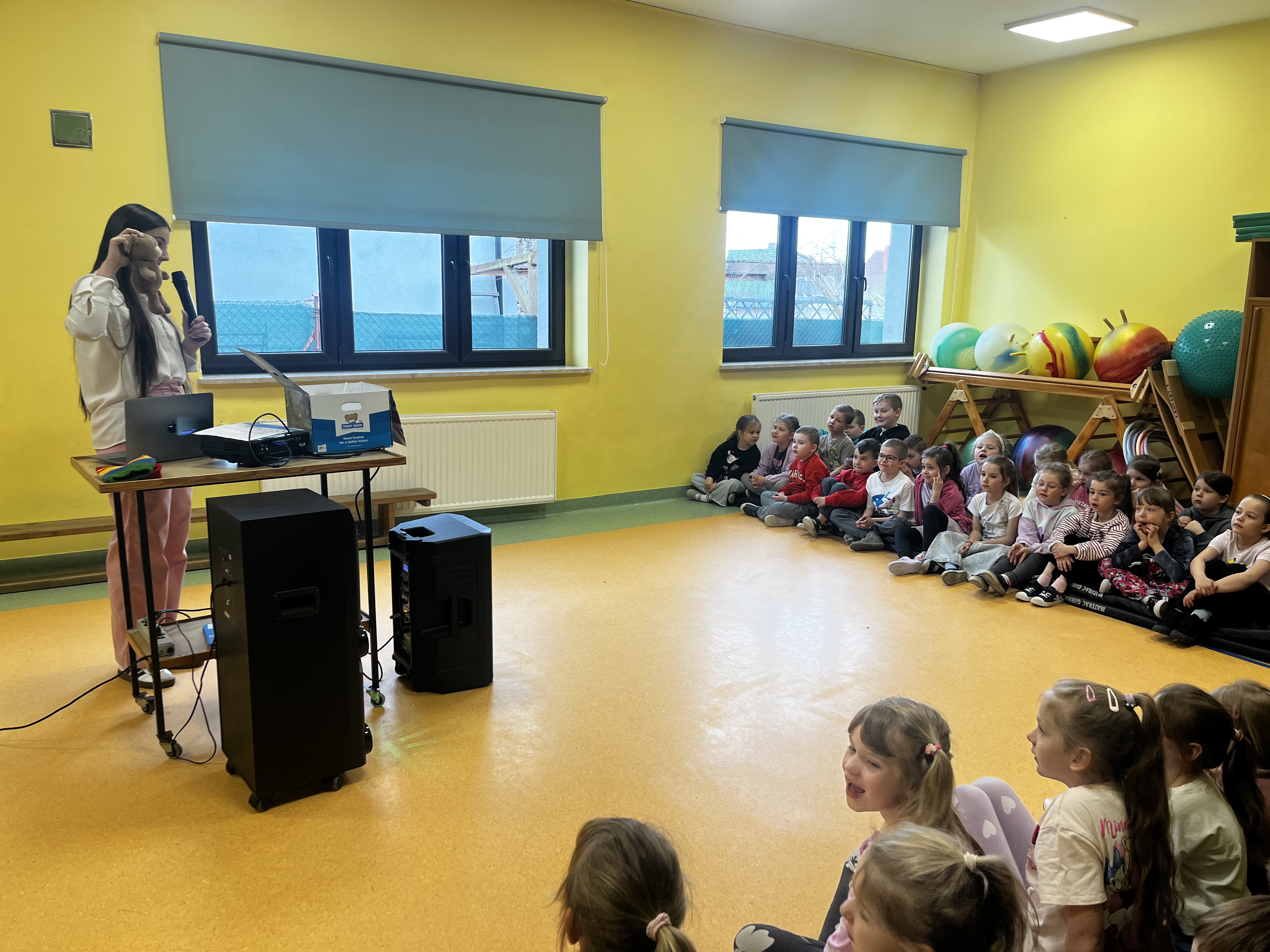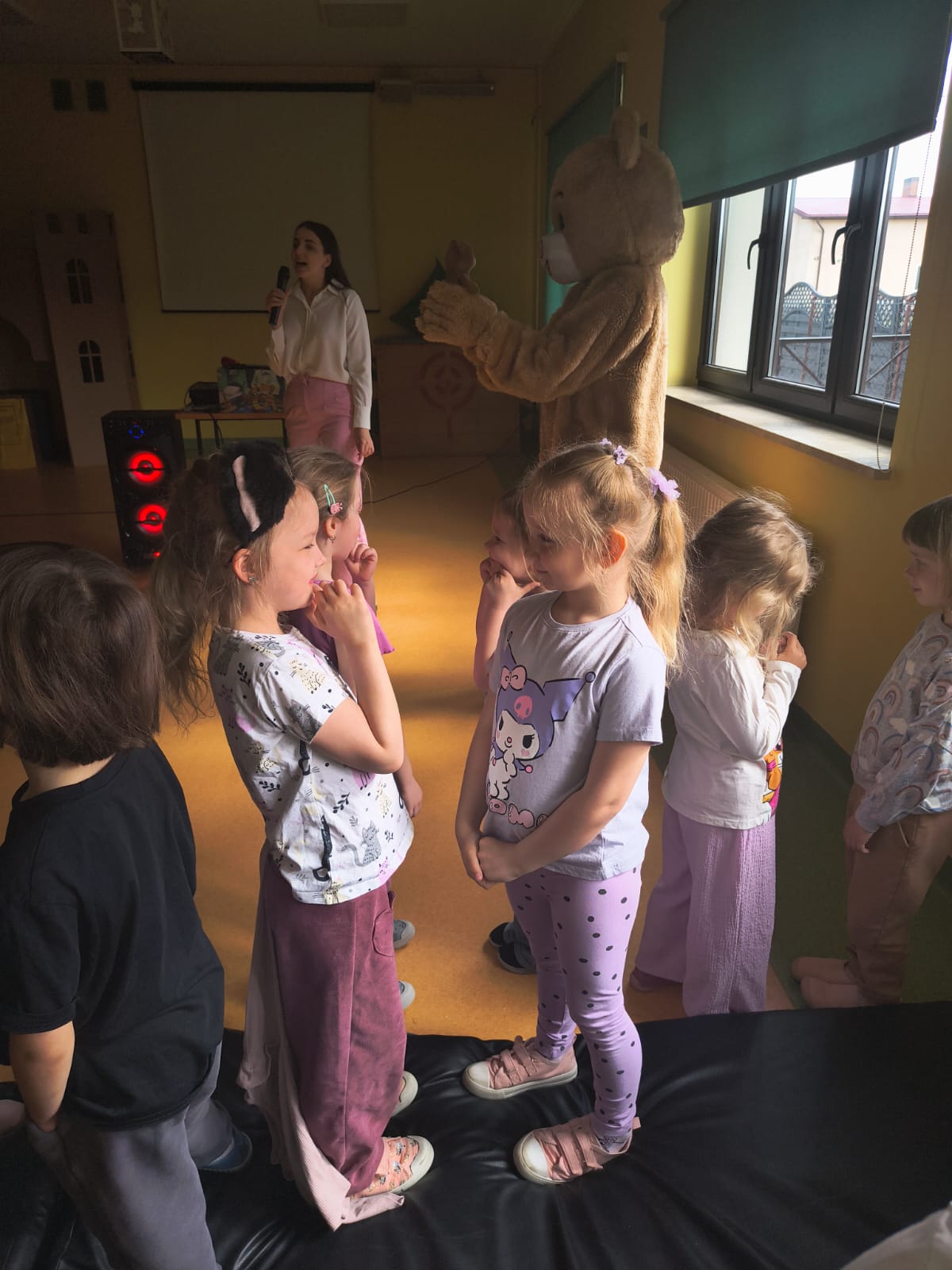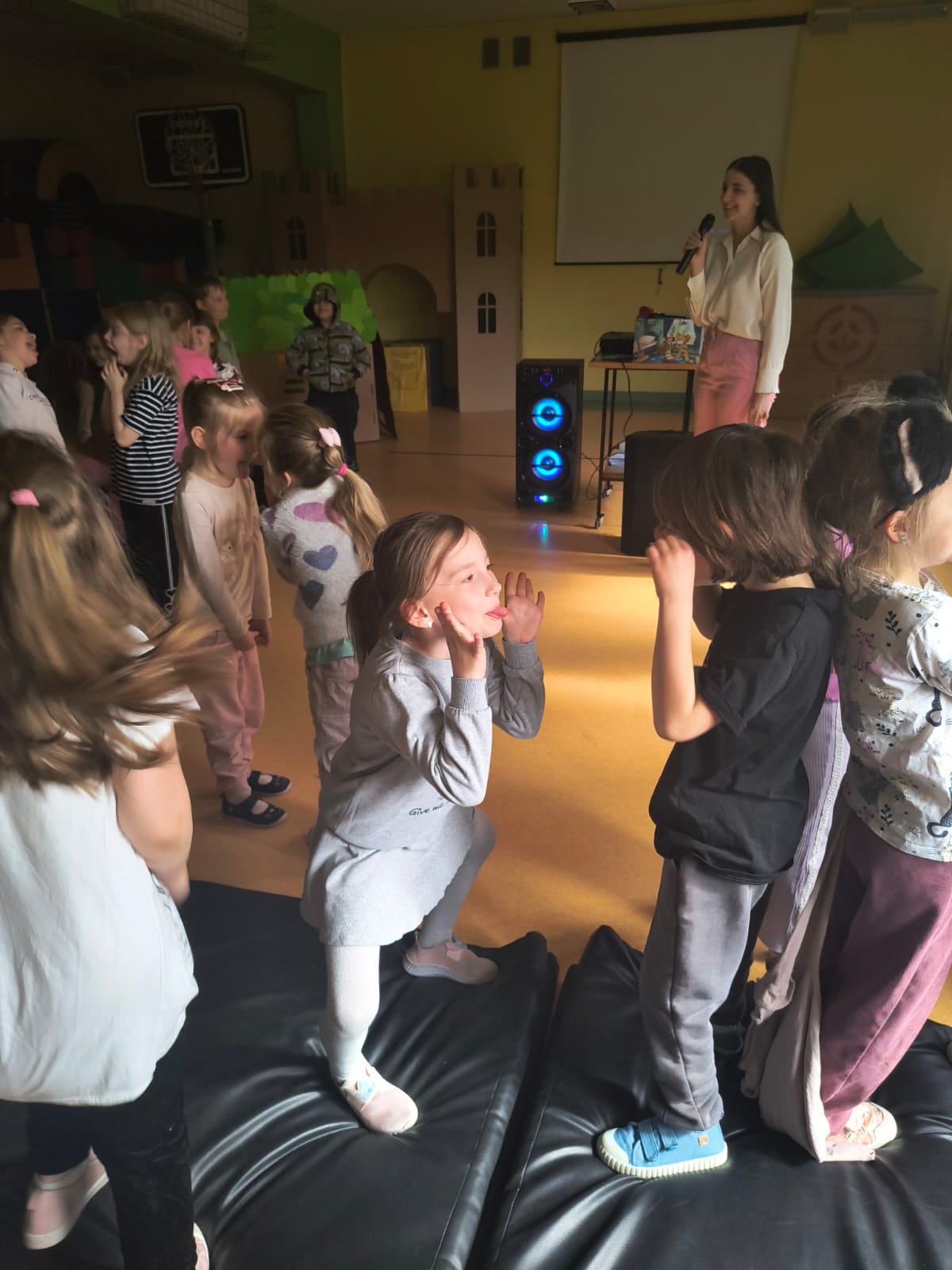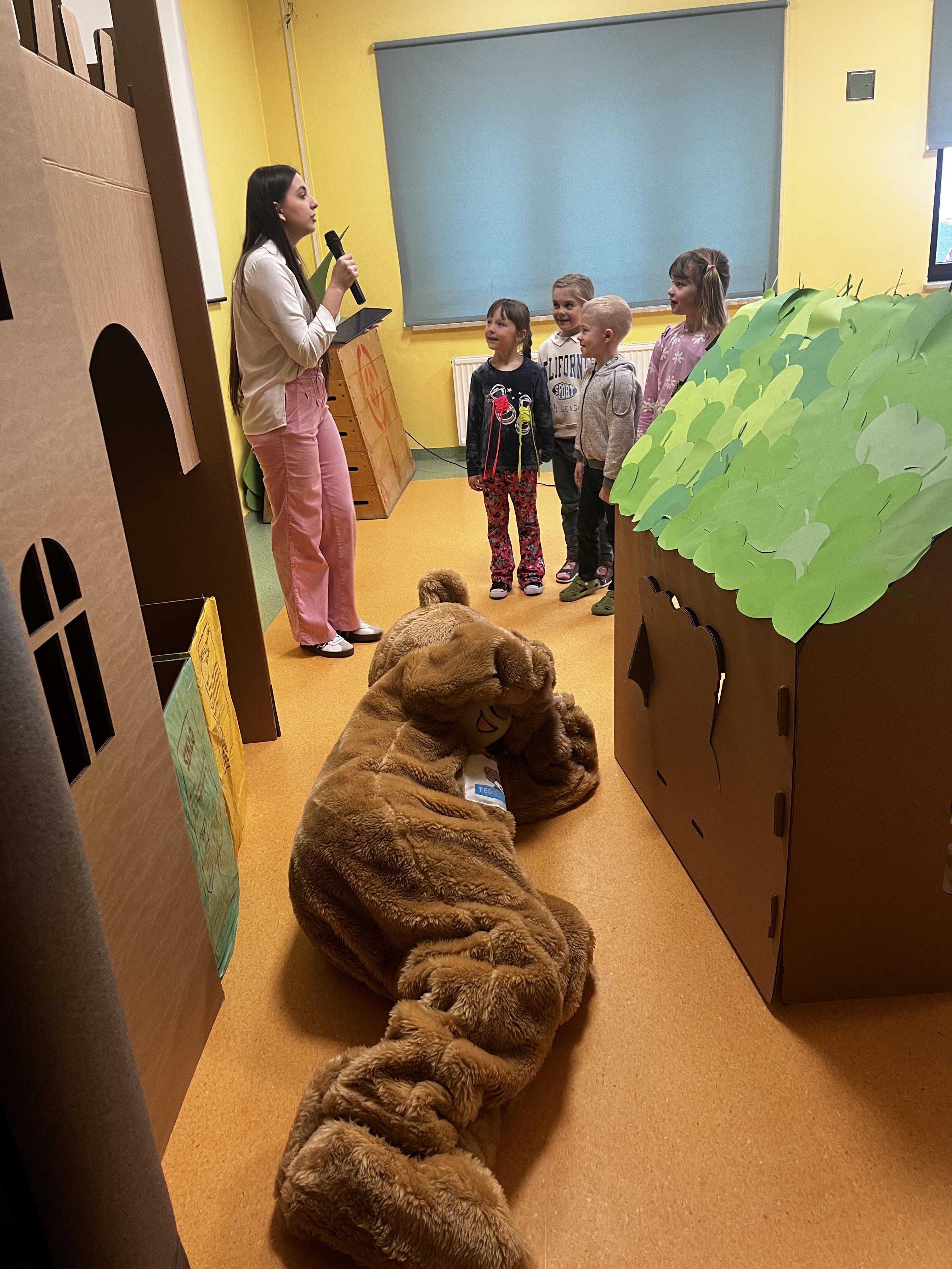 Podczas występu szczególną uwagę zwrócono na emocje – radość, smutek, złość czy zdziwienie – które były przedstawiane w sposób przystępny i zrozumiały dla najmłodszych. Dzięki interaktywnym elementom dzieci mogły aktywnie uczestniczyć w przedstawieniu, nazywać emocje oraz reagować na polecenia w języku angielskim.
