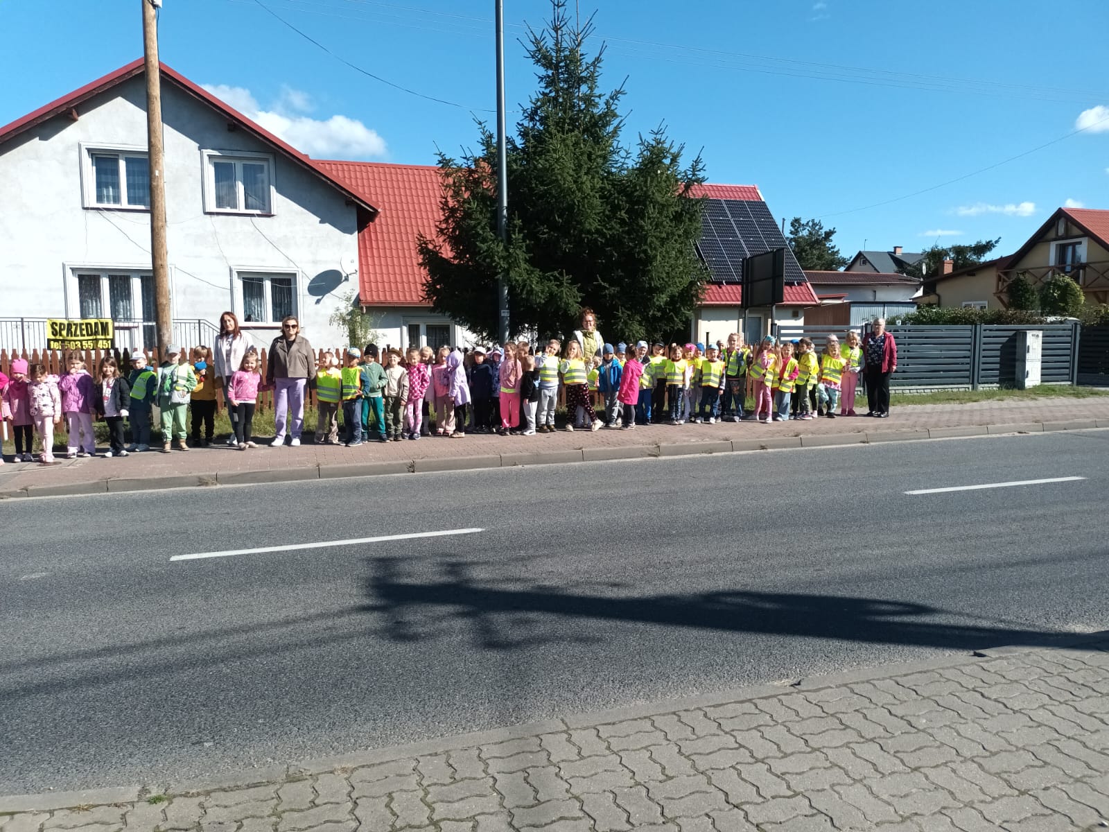 Przedszkolaki udały się na spacer na najbliższe przejście dla pieszych.