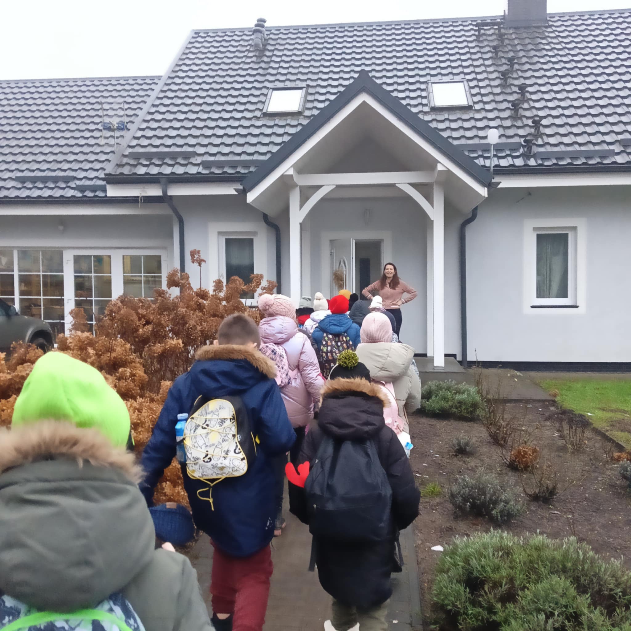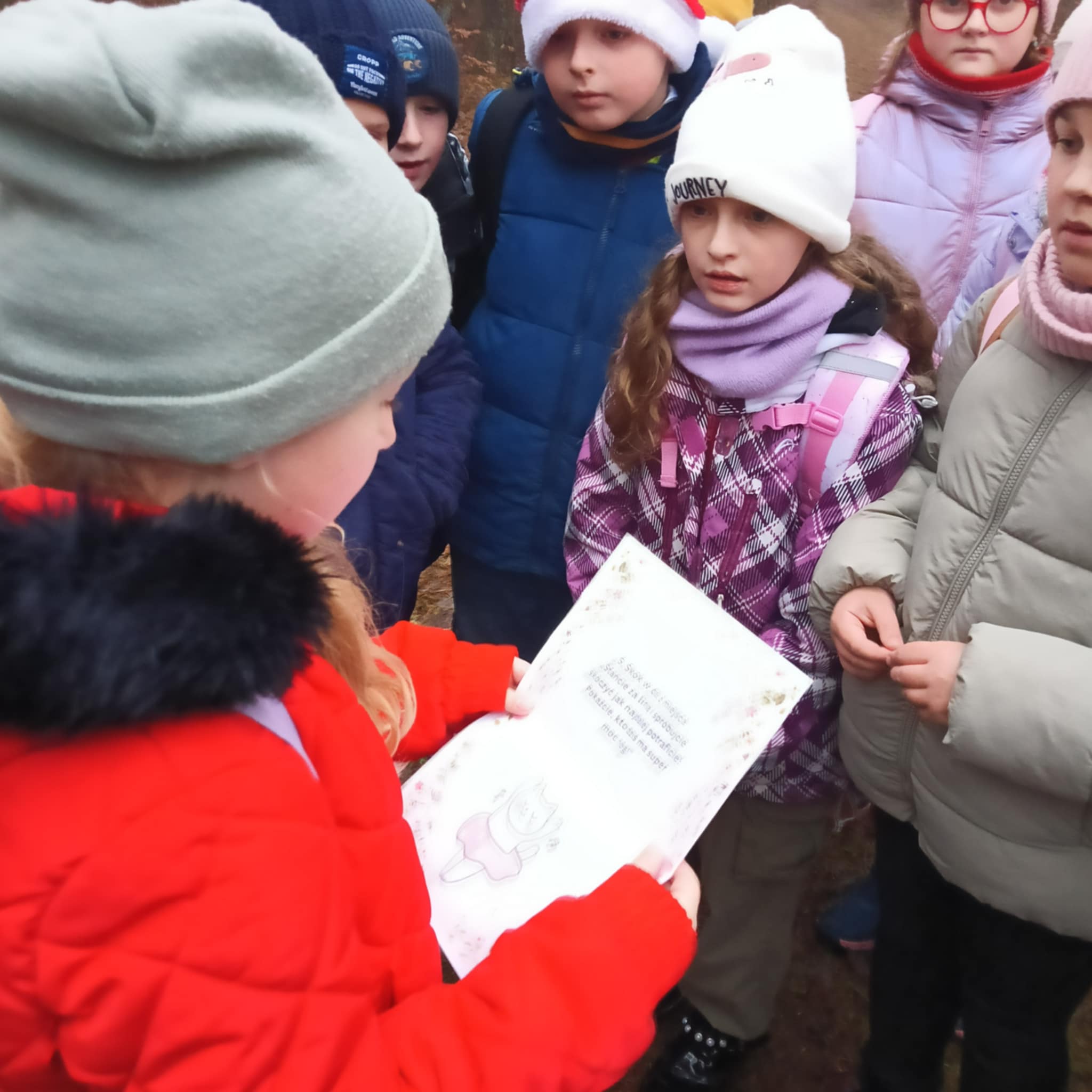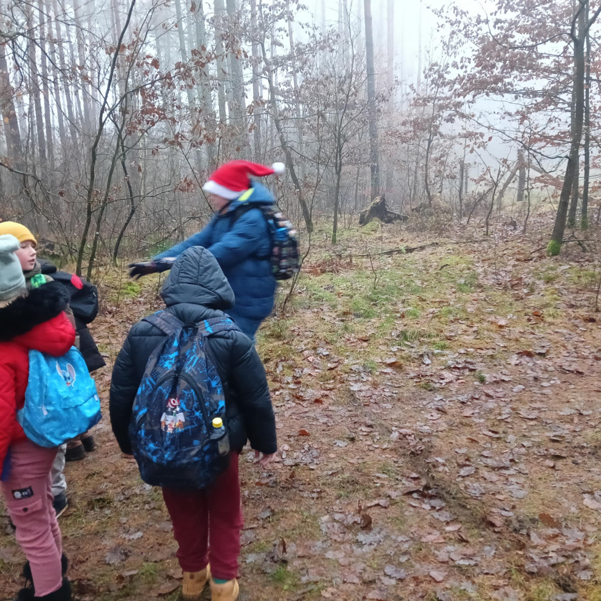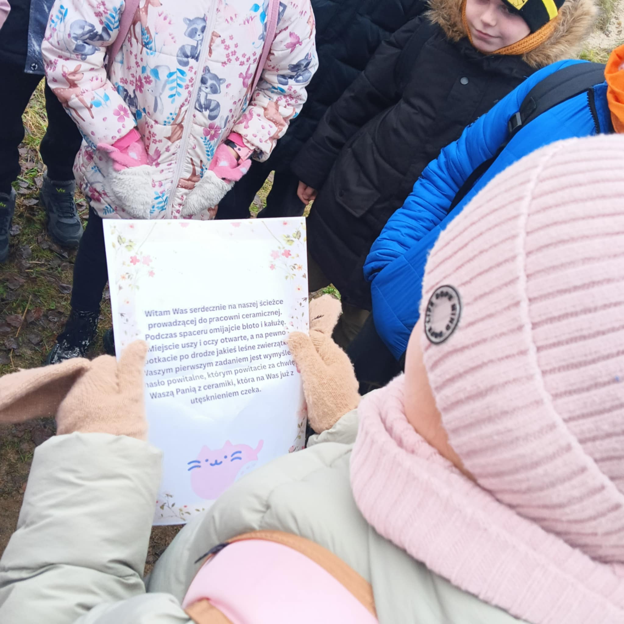 Dnia 05.12.2025r. klasa 3c wybrała się na świąteczne warsztaty ceramiczne do Pani Doroty Wróbel. Już sama droga była niezwykła – uczniowie musieli przejść 1,5 km przez las, rozwiązując zadania przygotowane przez gospodynię. Wszyscy wykonywali je z ogromnym zaangażowaniem i radością. Na końcu wędrówki dzieci zobaczyły biały domek stojący przy stawie, w którym mieszka Gang Słodziaków – pies Sonia, kot, króliczki i kaczki biegusy. W progu czekała już Pani Dorota, która przywitała klasę bardzo serdecznie.