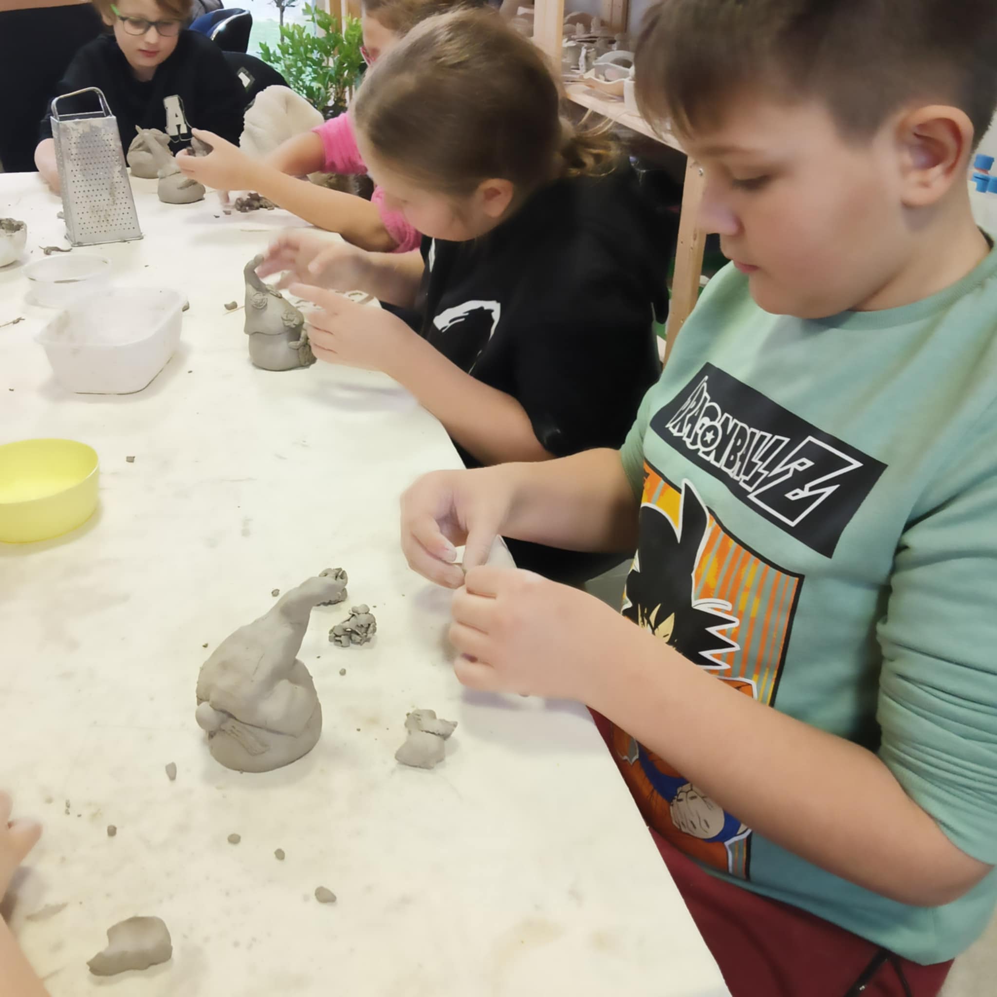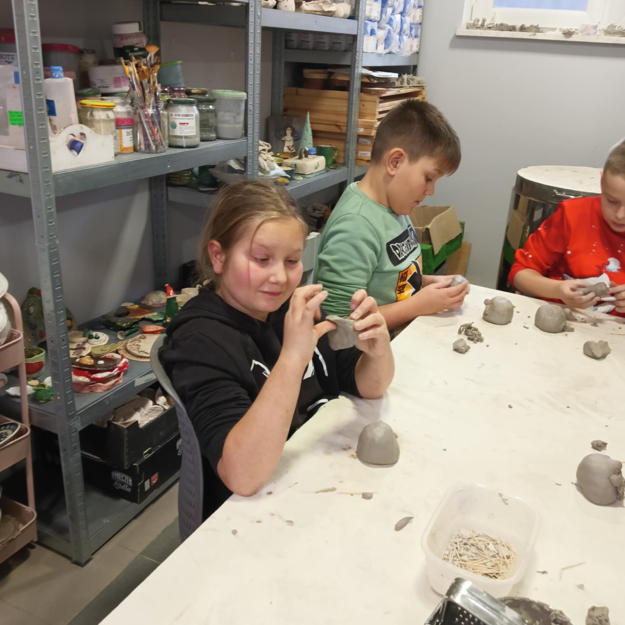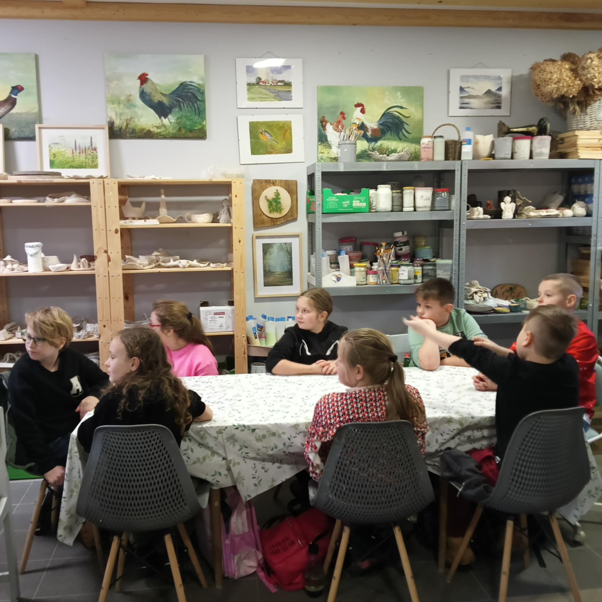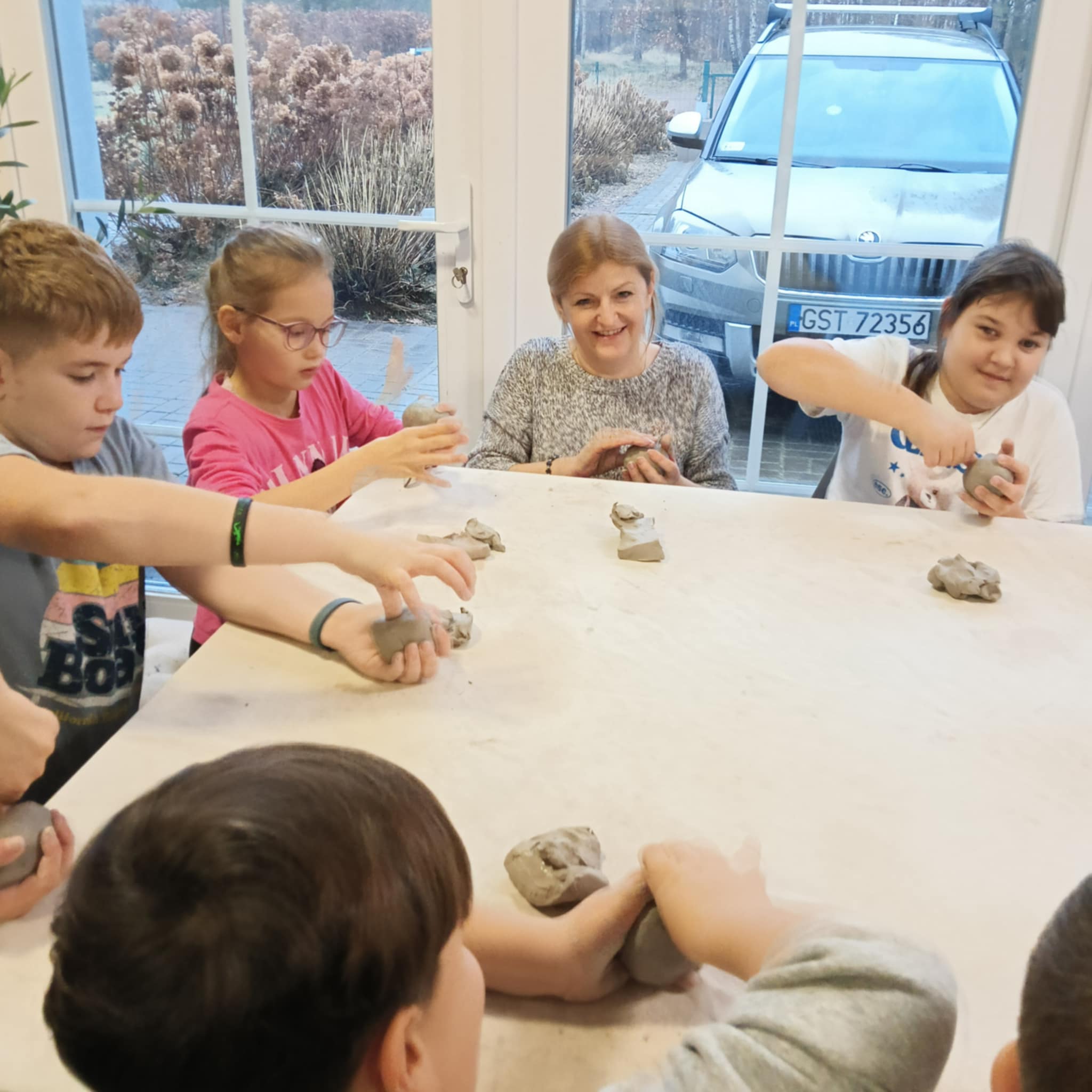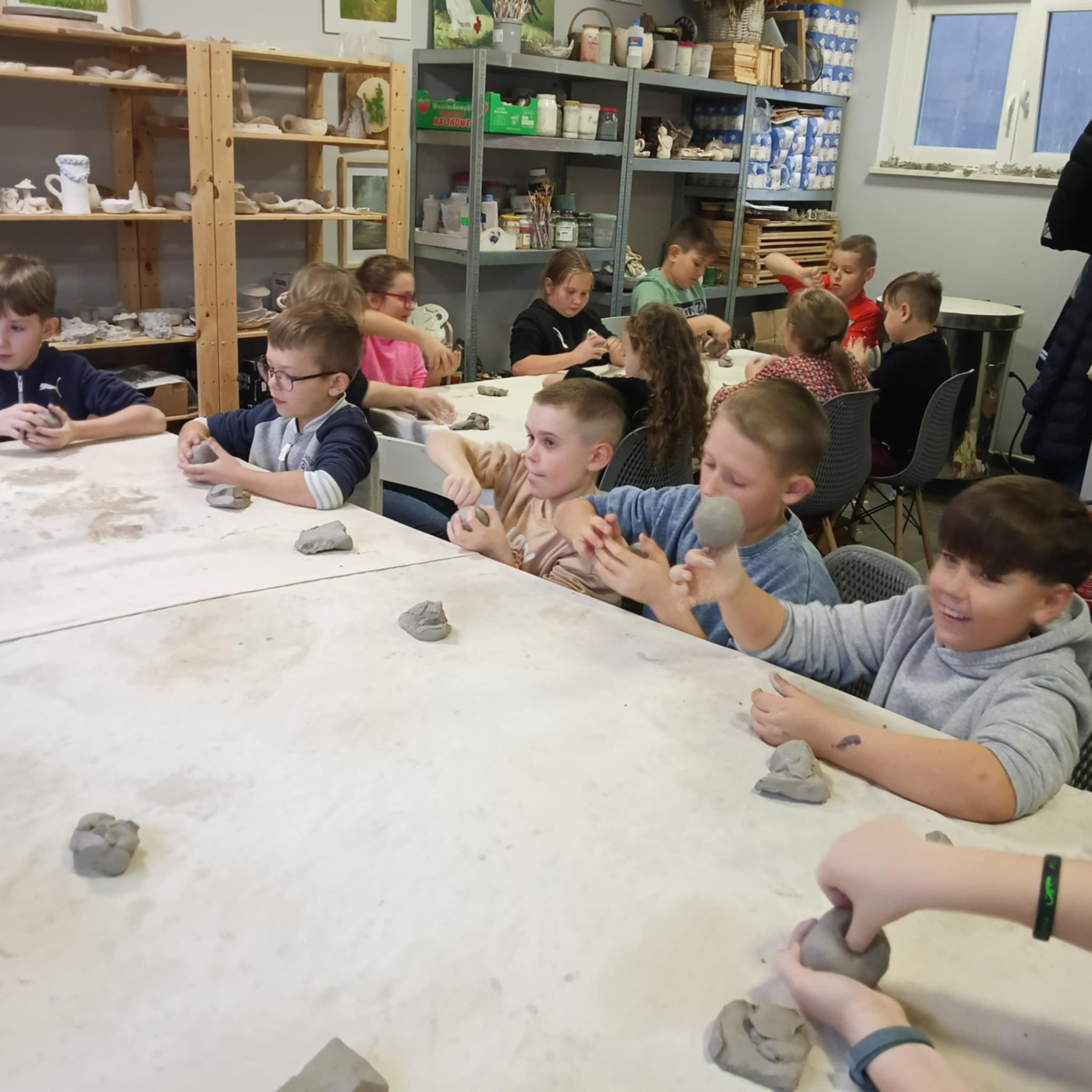 Podczas warsztatów uczniowie poznali tajniki pracy z gliną, dowiedzieli się skąd się ją wydobywa i krok po kroku nauczyli się, jak ulepić świątecznego skrzata. Największą atrakcją było lepienie na kole garncarskim – sprawiło ono dzieciom mnóstwo radości i pozwoliło poczuć się jak prawdziwi artyści. Na zakończenie wycieczki uczniowie nakarmili króliczki, podziwiali kaczki biegusy i bawili się z pieskiem Sonią.