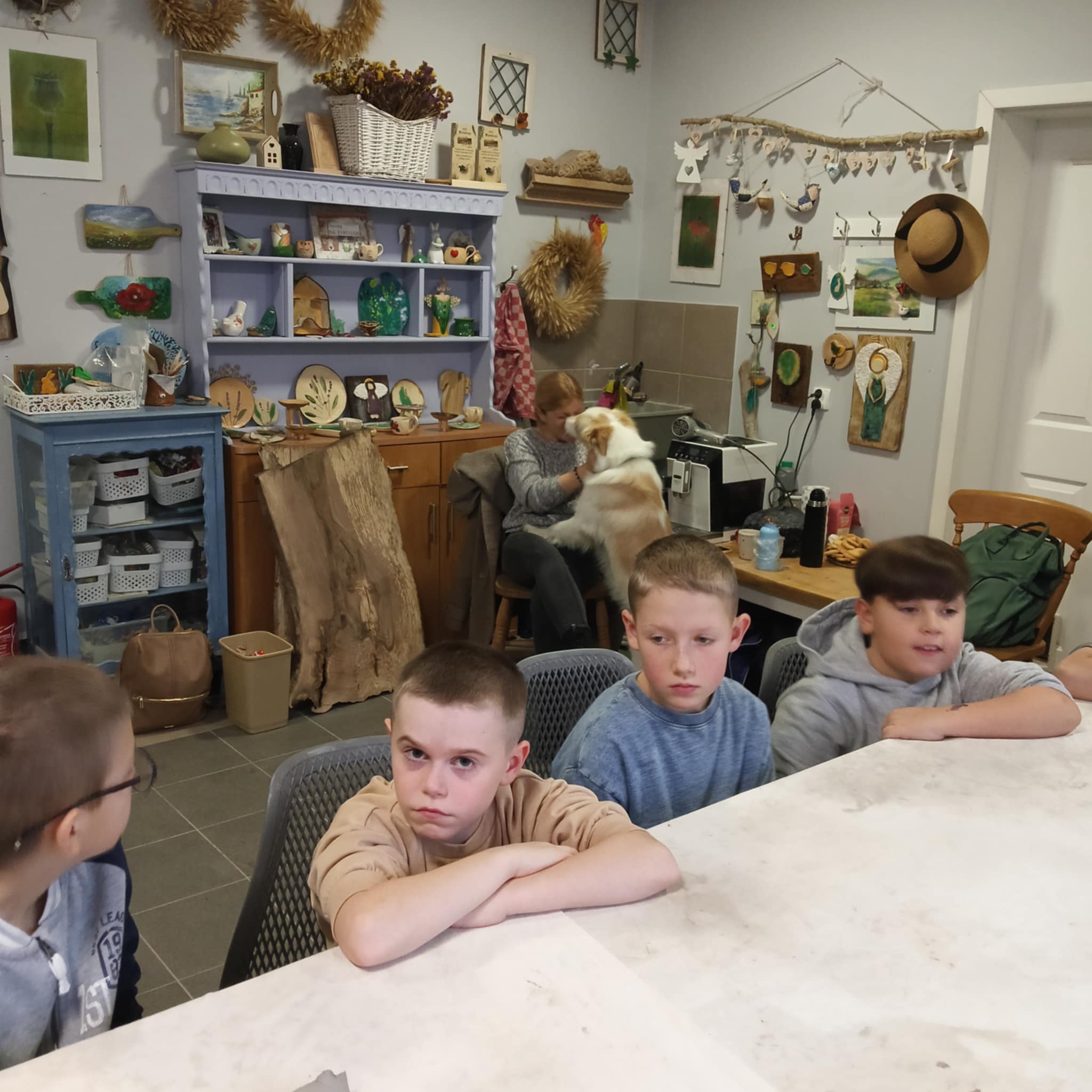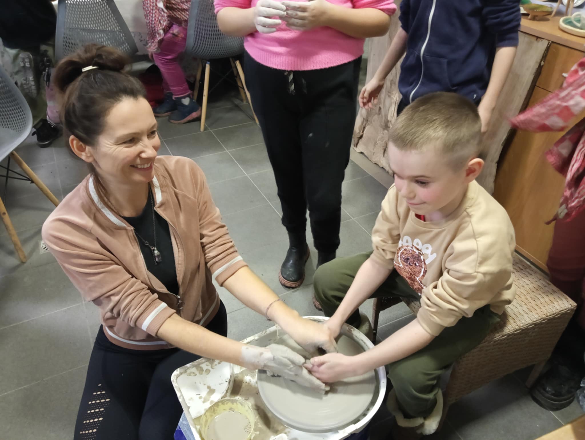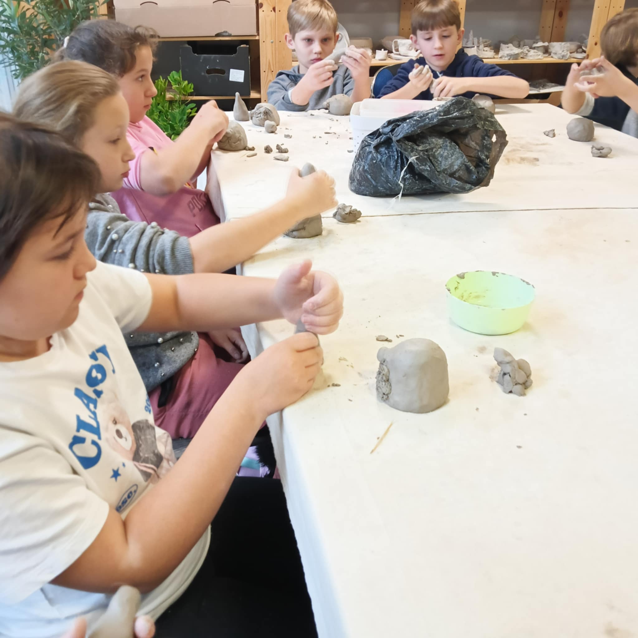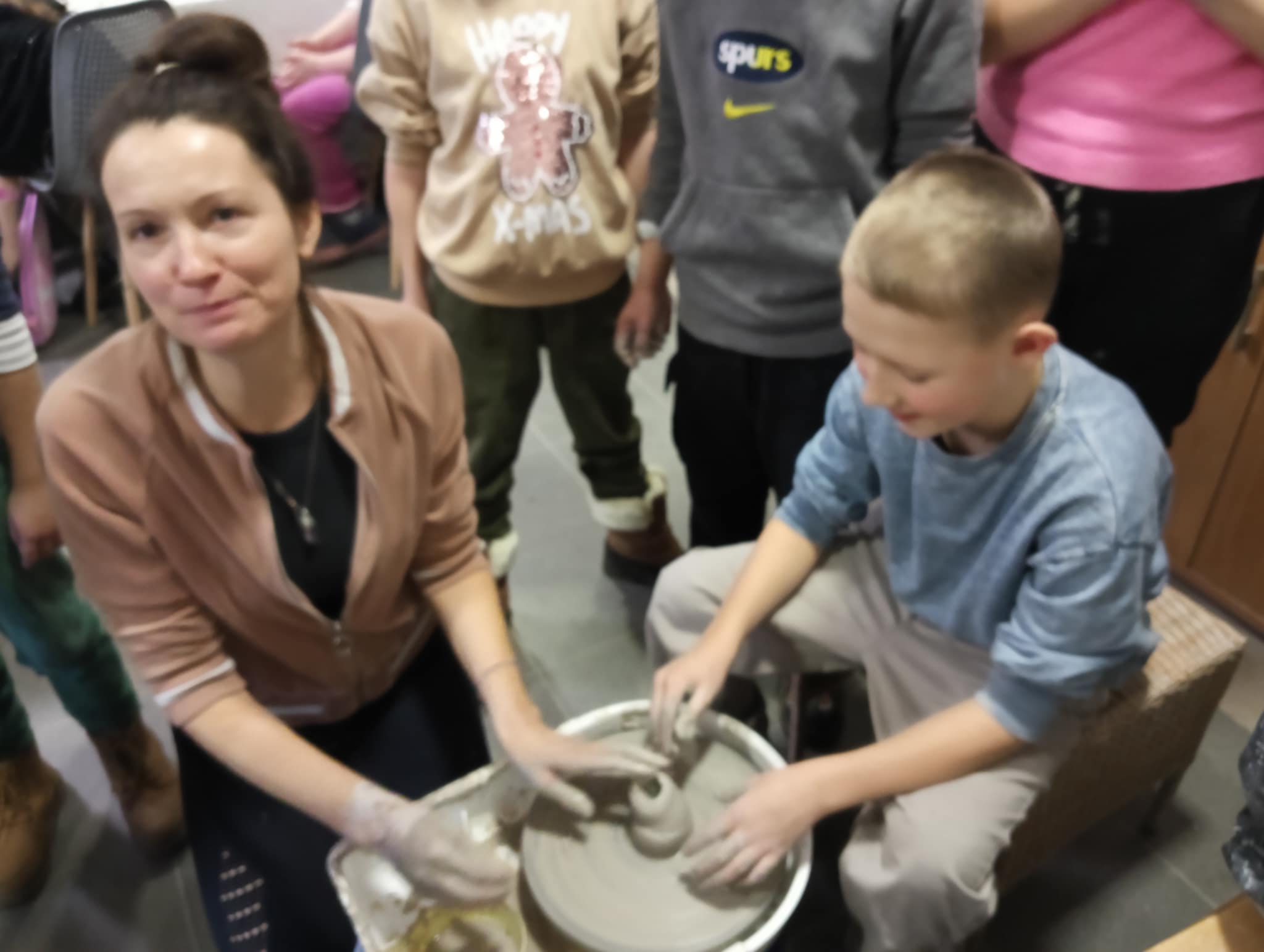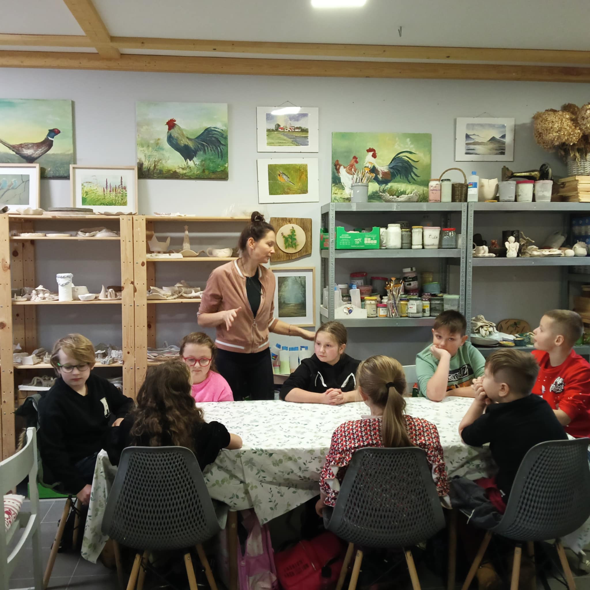 Podczas warsztatów uczniowie poznali tajniki pracy z gliną, dowiedzieli się skąd się ją wydobywa i krok po kroku nauczyli się, jak ulepić świątecznego skrzata. Największą atrakcją było lepienie na kole garncarskim – sprawiło ono dzieciom mnóstwo radości i pozwoliło poczuć się jak prawdziwi artyści. Na zakończenie wycieczki uczniowie nakarmili króliczki, podziwiali kaczki biegusy i bawili się z pieskiem Sonią.