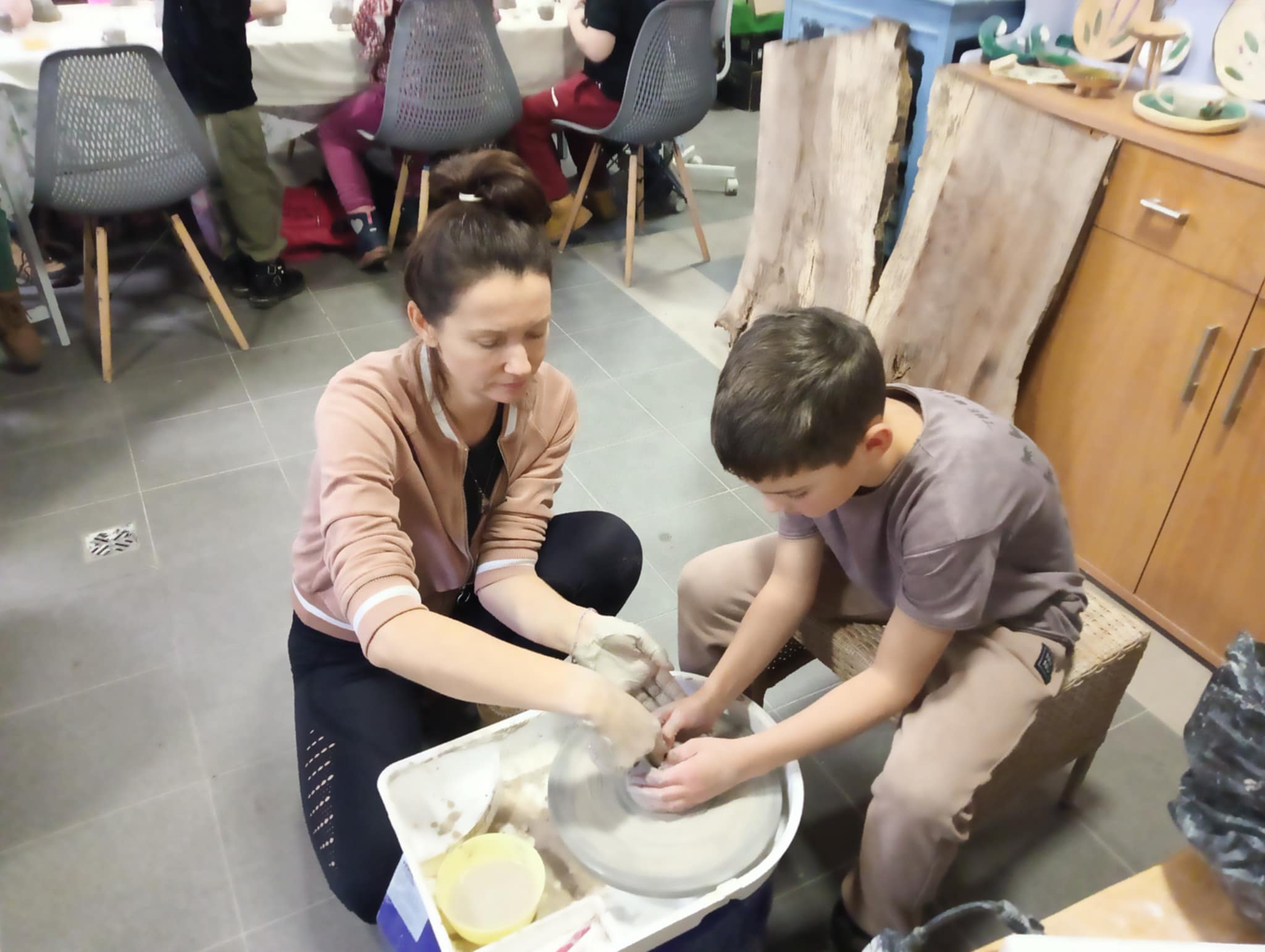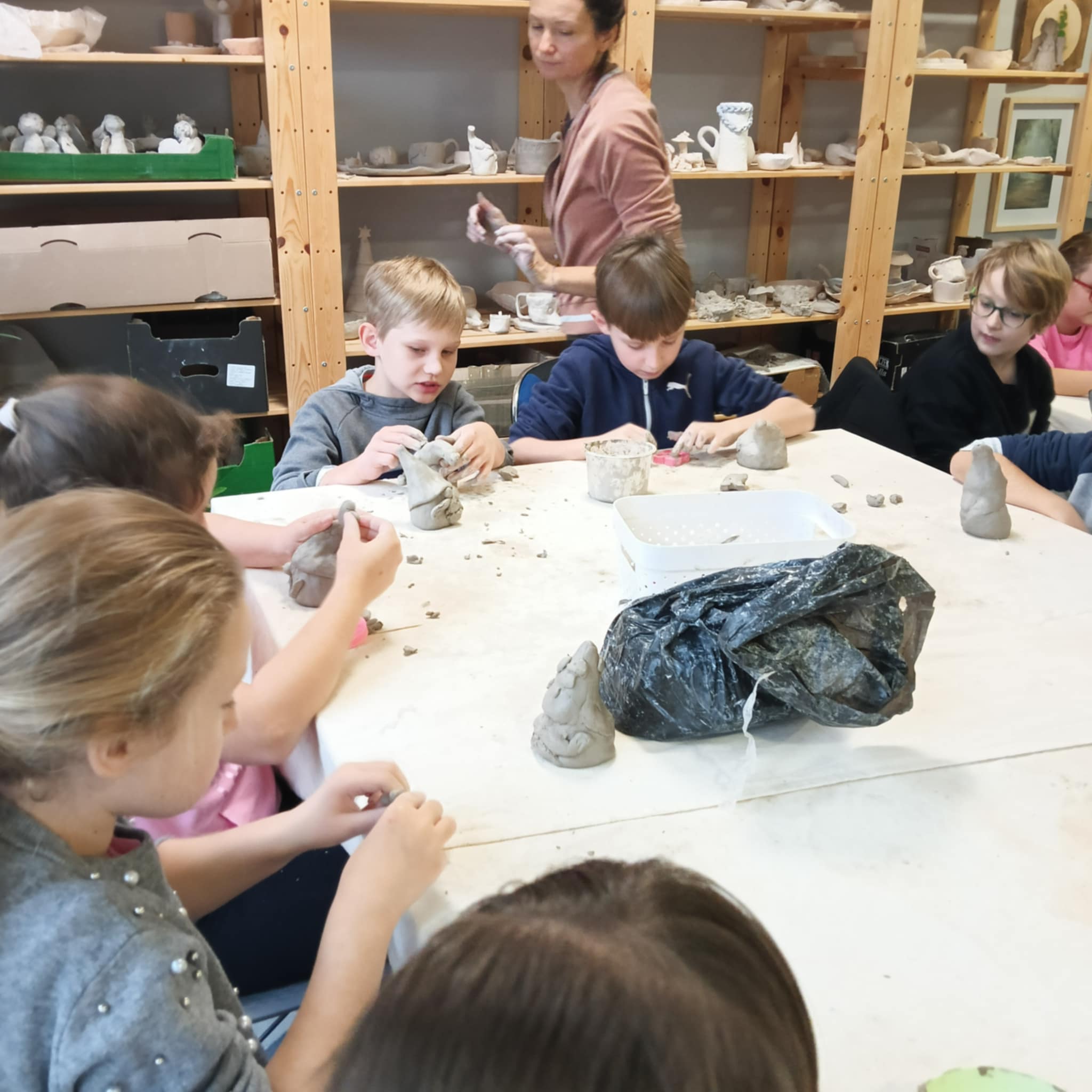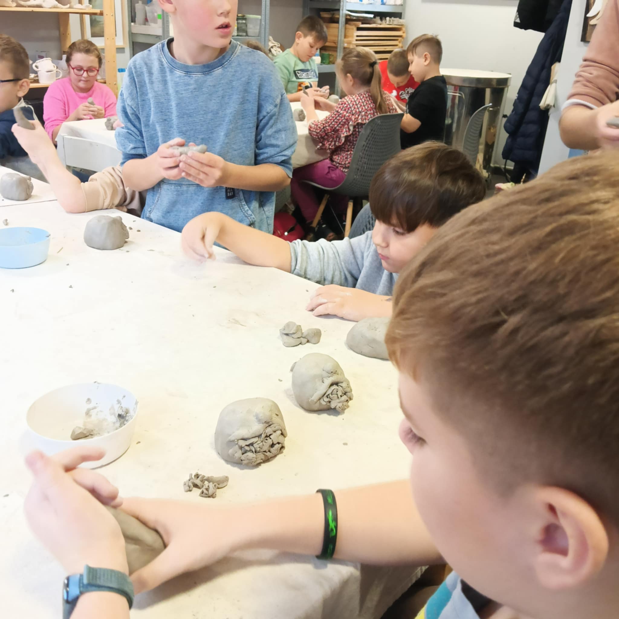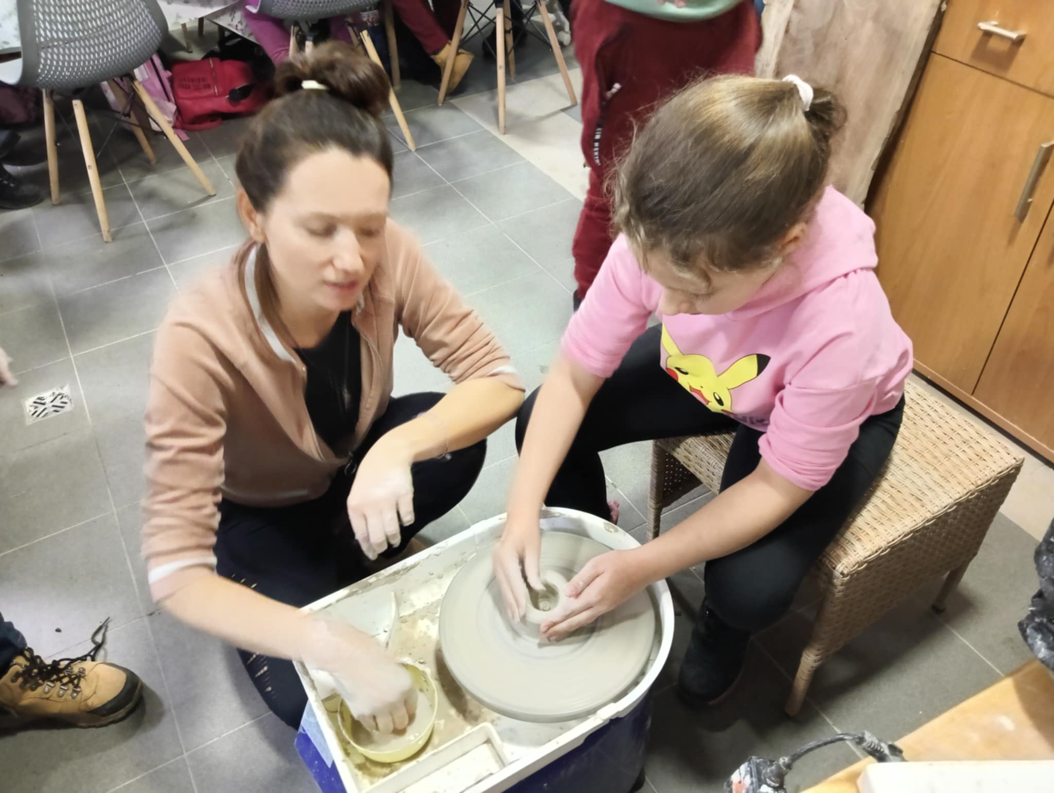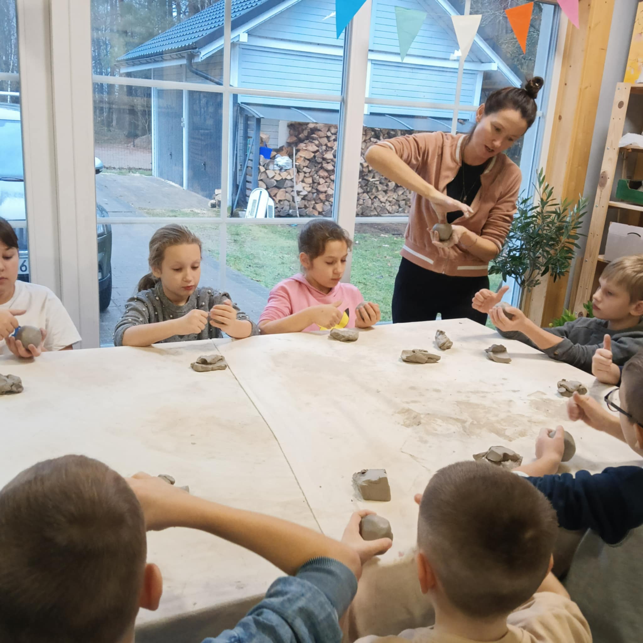 Podczas warsztatów uczniowie poznali tajniki pracy z gliną, dowiedzieli się skąd się ją wydobywa i krok po kroku nauczyli się, jak ulepić świątecznego skrzata. Największą atrakcją było lepienie na kole garncarskim – sprawiło ono dzieciom mnóstwo radości i pozwoliło poczuć się jak prawdziwi artyści. Na zakończenie wycieczki uczniowie nakarmili króliczki, podziwiali kaczki biegusy i bawili się z pieskiem Sonią.