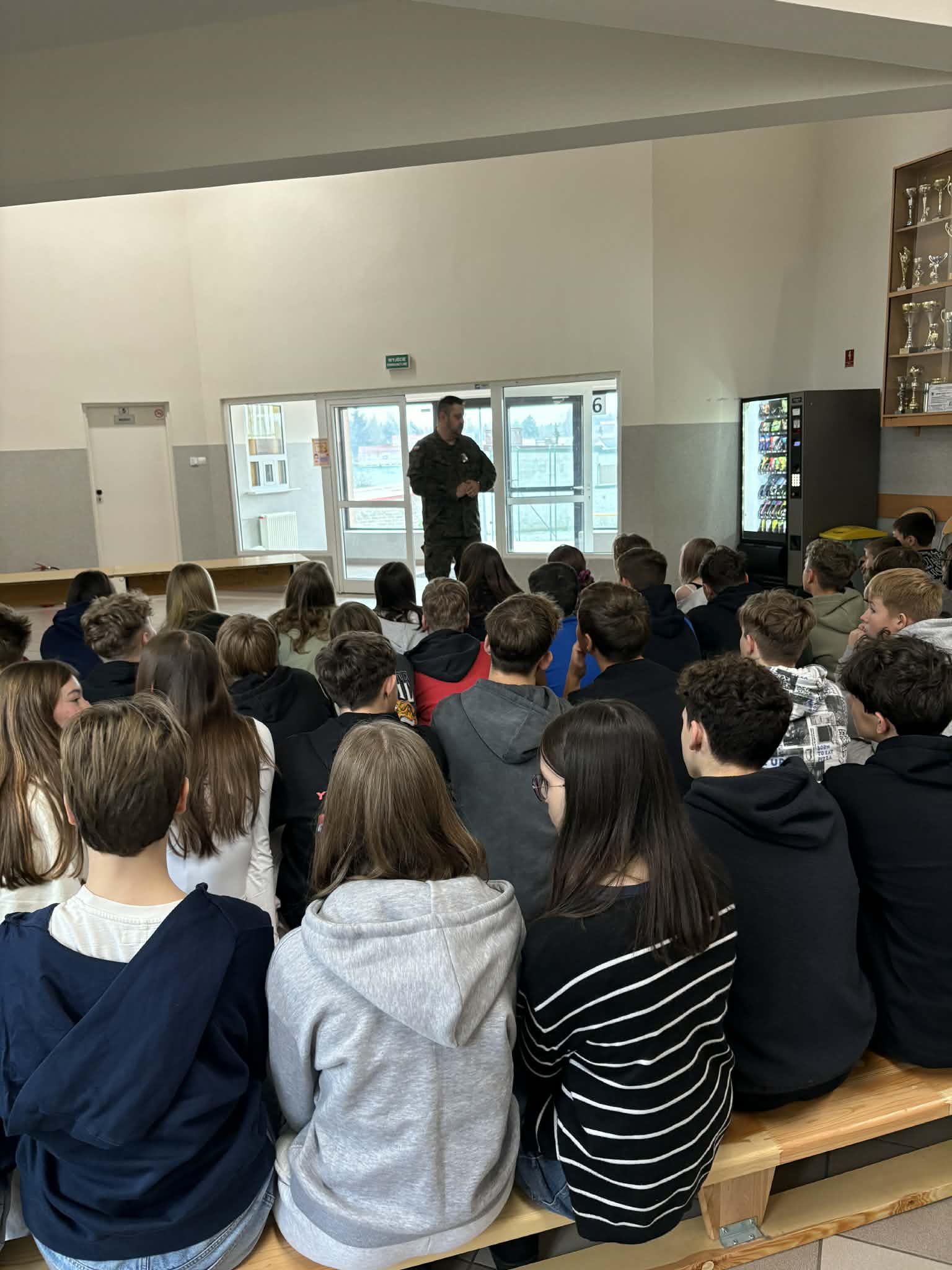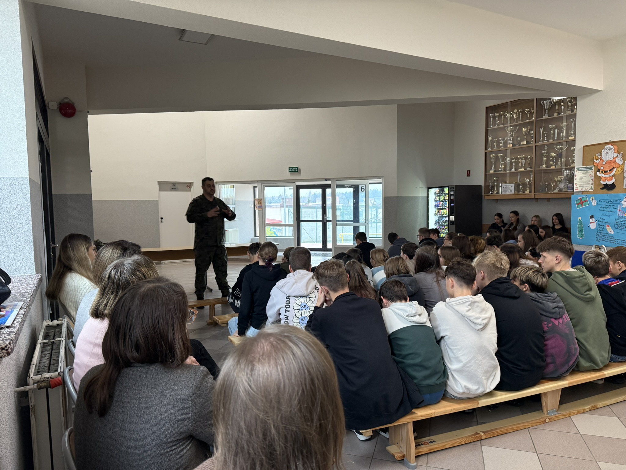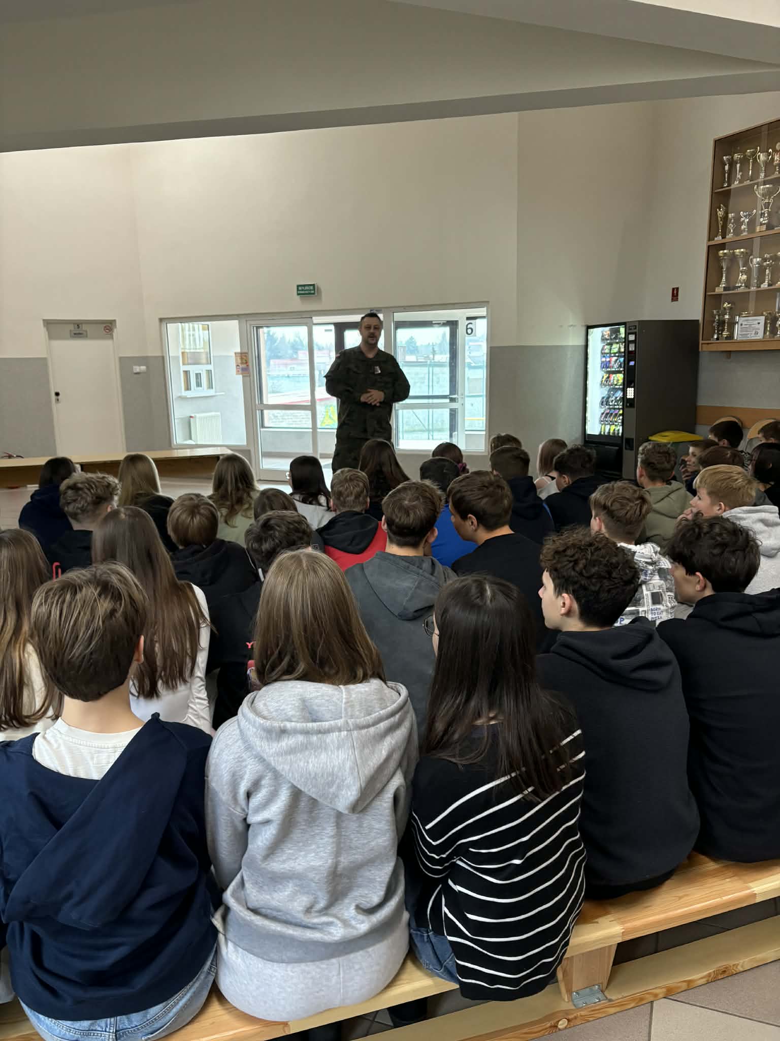 Dziś uczniowie klas 7 i 8 mieli wyjątkową okazję uczestniczyć w spotkaniu z żołnierzem 2. kompanii 83. Batalionu Lekkiej Piechoty, mł.chor. Przemysławem Zarasiem. Podczas wizyty młodzież dowiedziała się, jak wygląda codzienna służba w Wojskach Obrony Terytorialnej, jakie umiejętności są niezbędne w pracy żołnierza oraz jak można dołączyć do WOT w przyszłości.