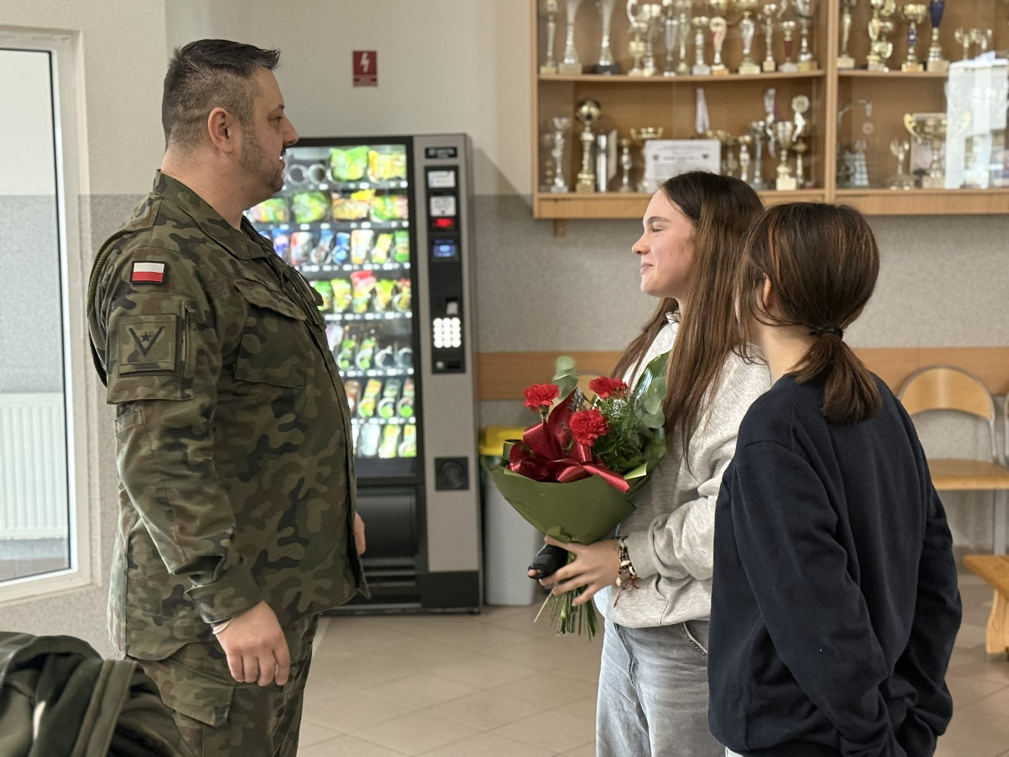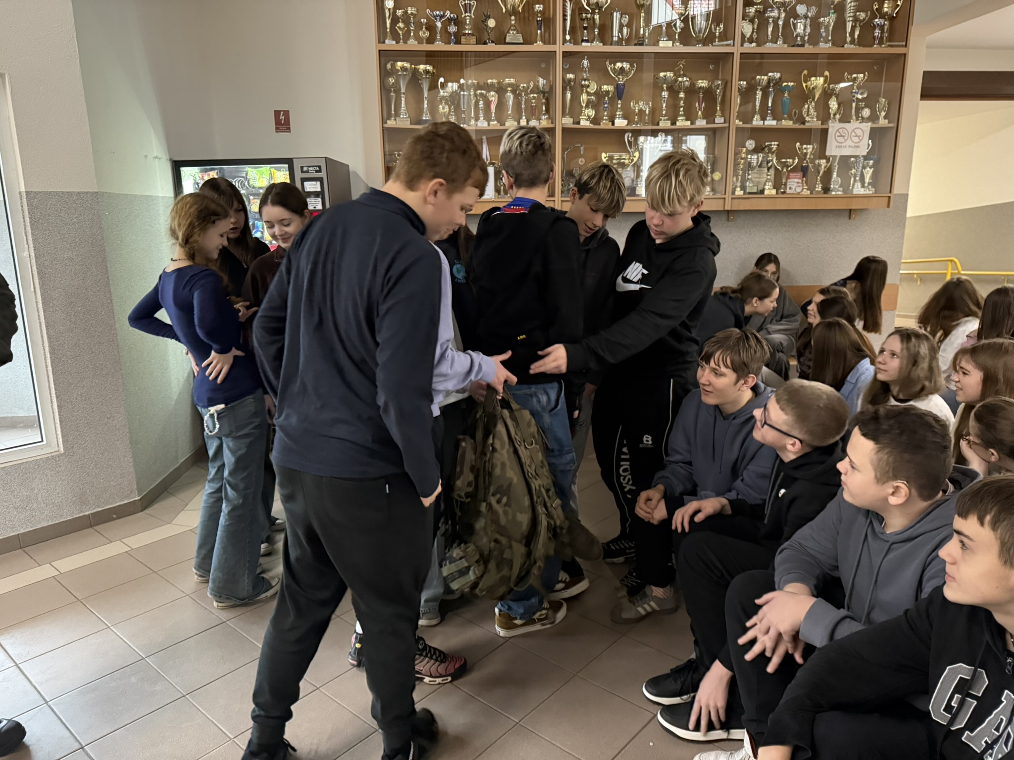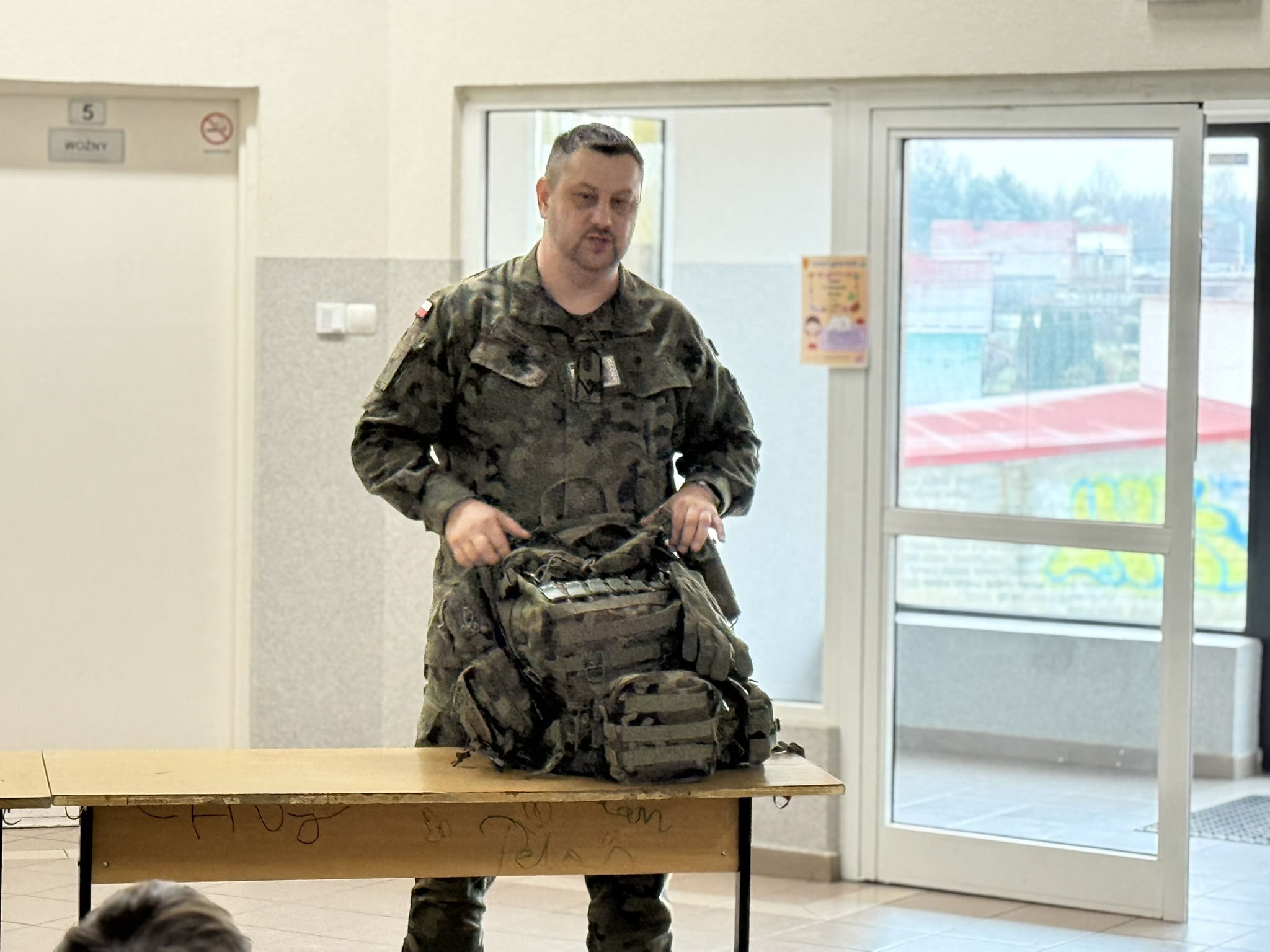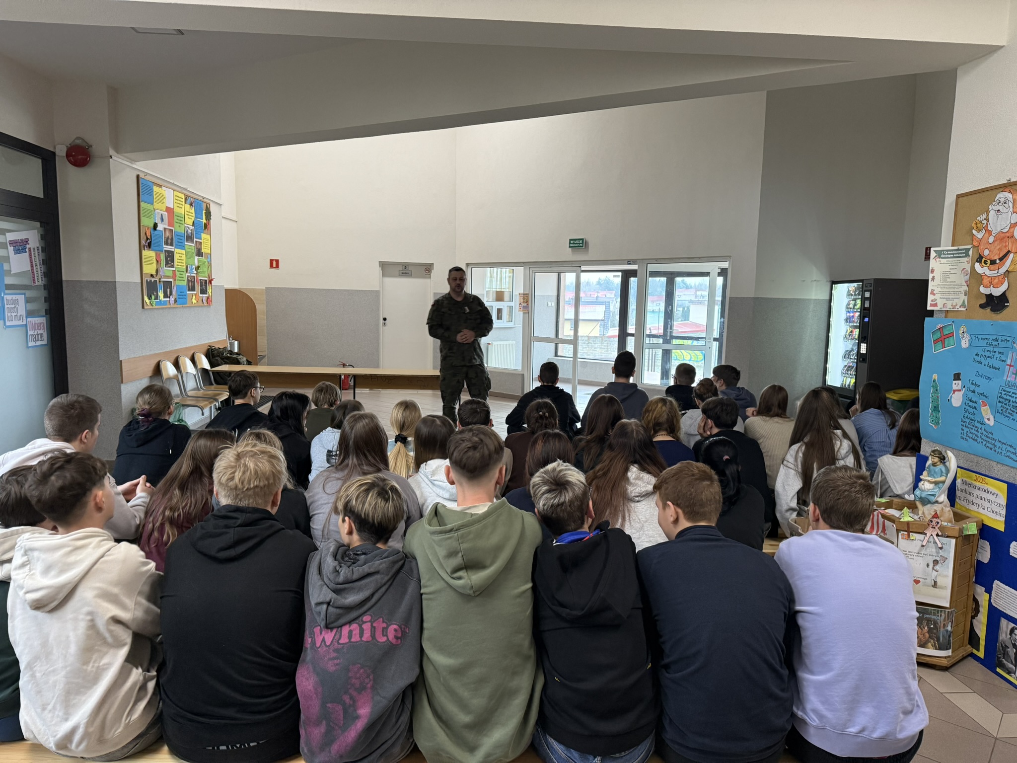 Dziś uczniowie klas 7 i 8 mieli wyjątkową okazję uczestniczyć w spotkaniu z żołnierzem 2. kompanii 83. Batalionu Lekkiej Piechoty, mł.chor. Przemysławem Zarasiem. Podczas wizyty młodzież dowiedziała się, jak wygląda codzienna służba w Wojskach Obrony Terytorialnej, jakie umiejętności są niezbędne w pracy żołnierza oraz jak można dołączyć do WOT w przyszłości.