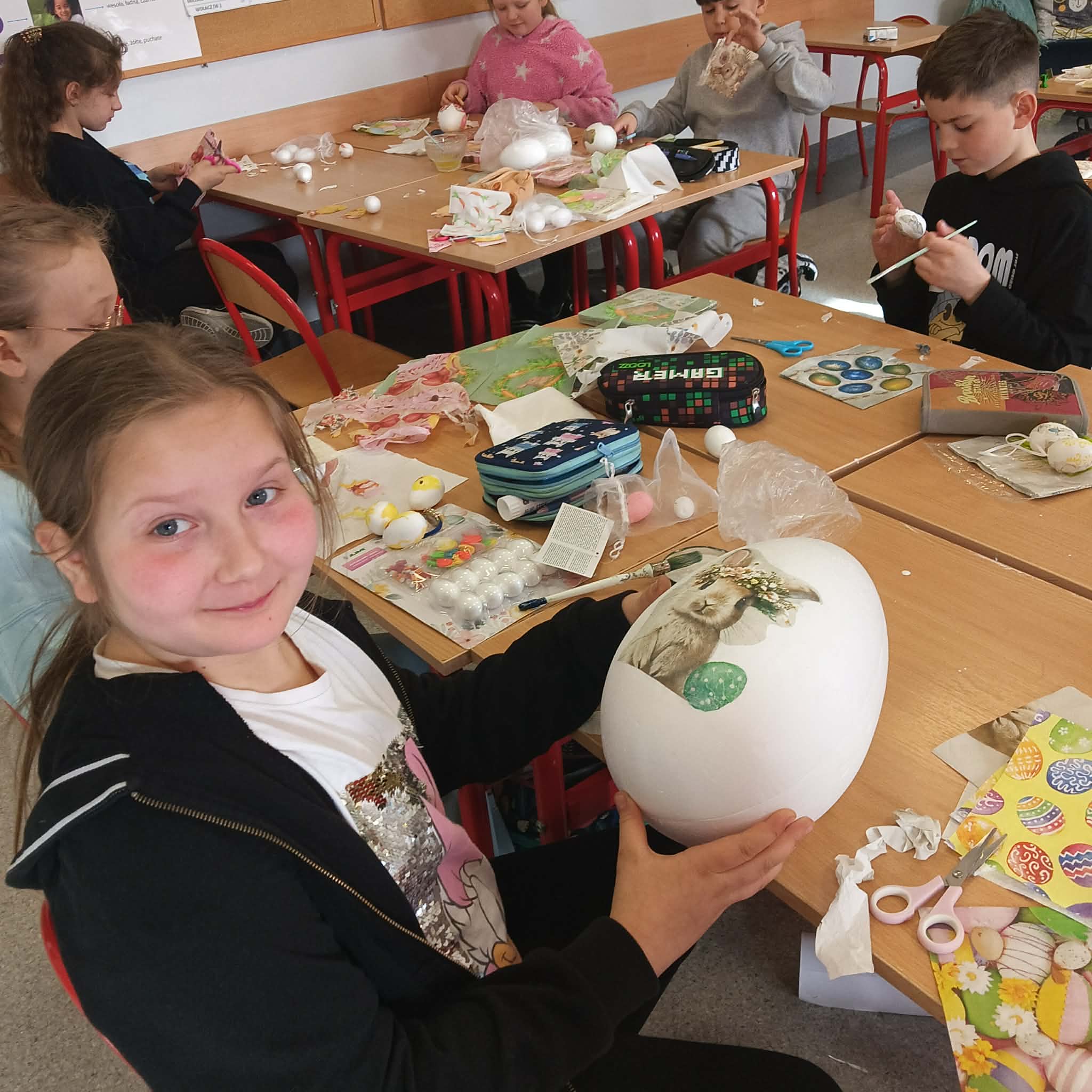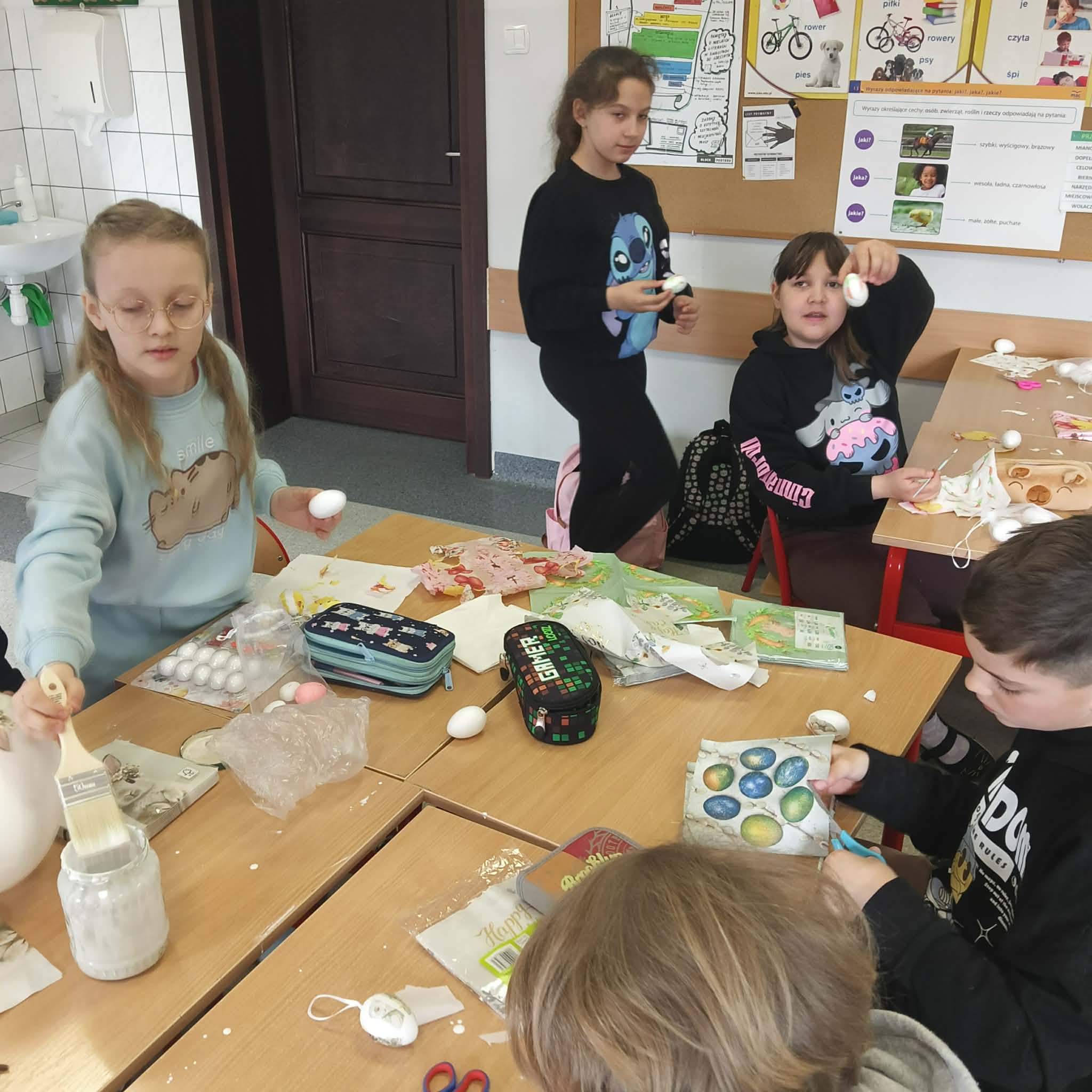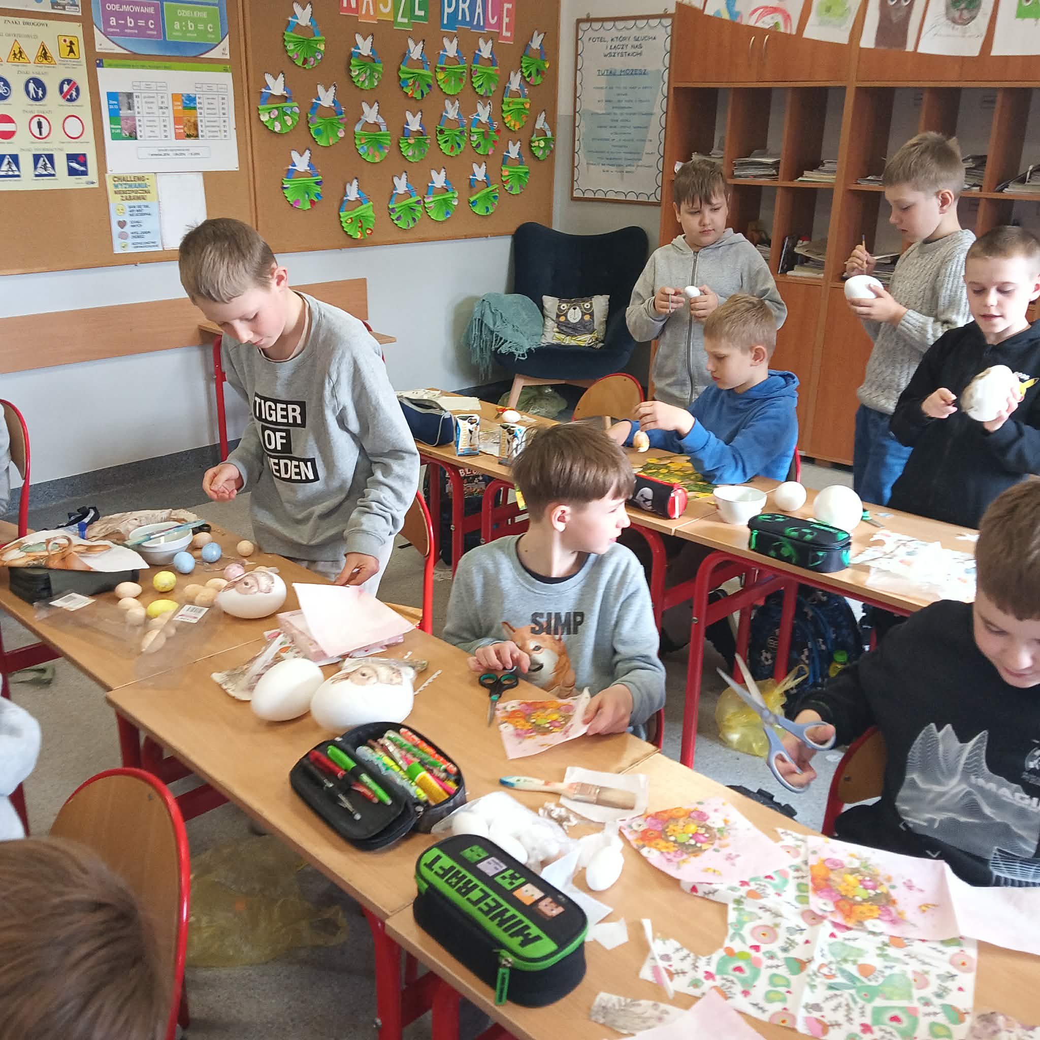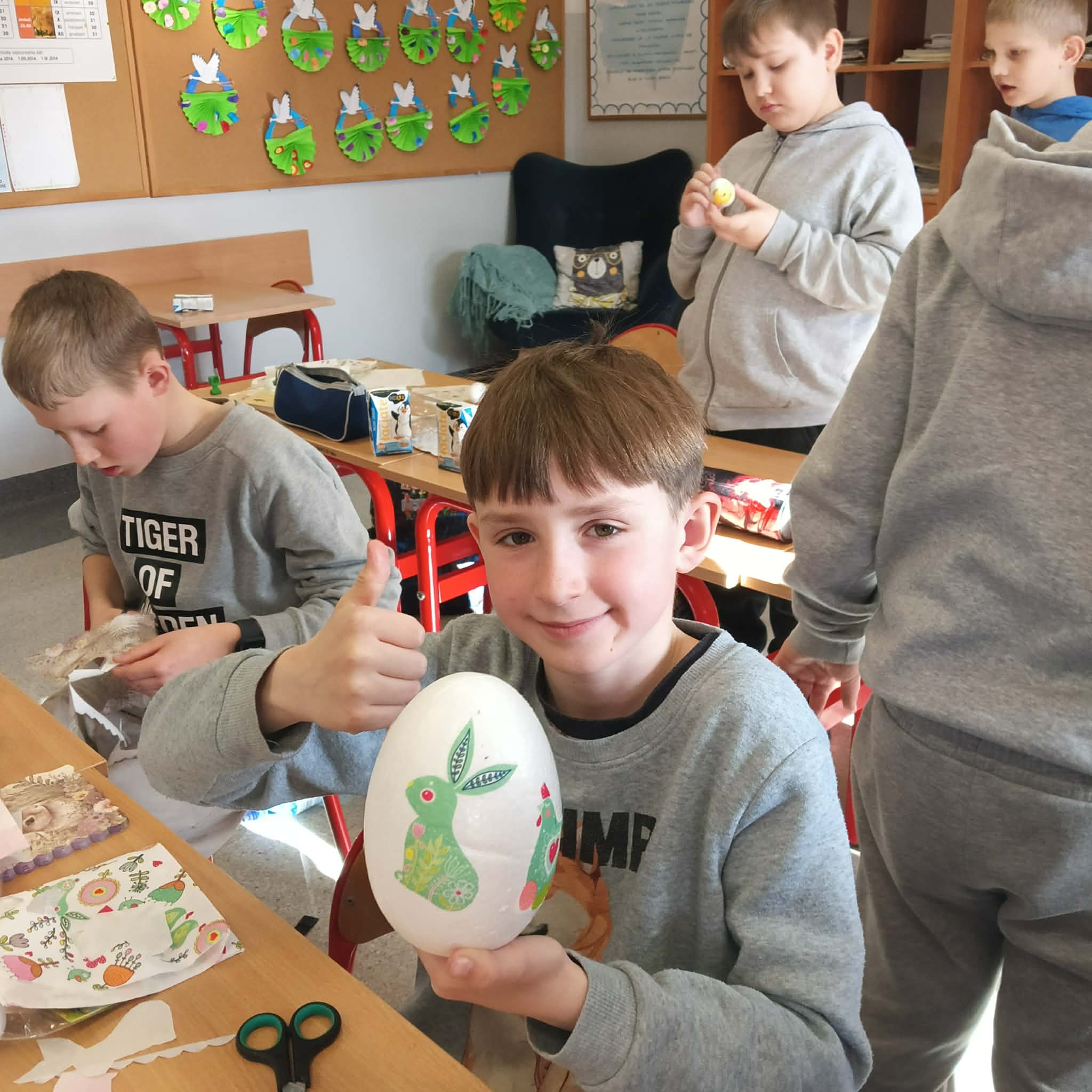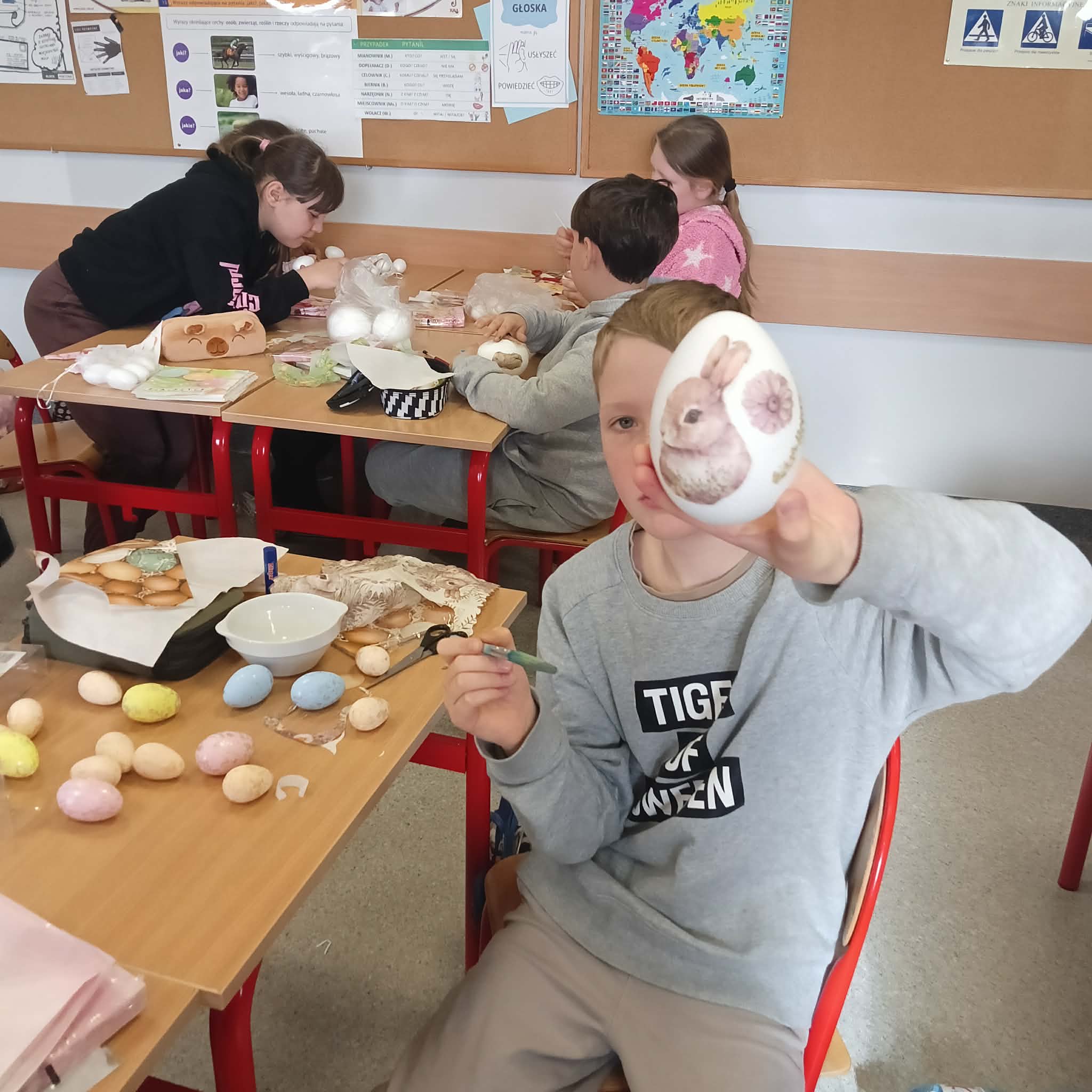 W klasie 3c odbyły się zajęcia kreatywne, podczas których uczniowie wykonywali pisanki wielkanocne techniką decoupage. Dzieci z dużym zaangażowaniem wybierały serwetki, komponowały wzory i starannie ozdabiały swoje jajka. Technika decoupage bardzo przypadła im do gustu — uczniowie byli dumni z efektów swojej pracy i z entuzjazmem opowiadali, że chcieliby wykorzystać ją również w domu do tworzenia kolejnych pisanek oraz innych ozdób wielkanocnych.