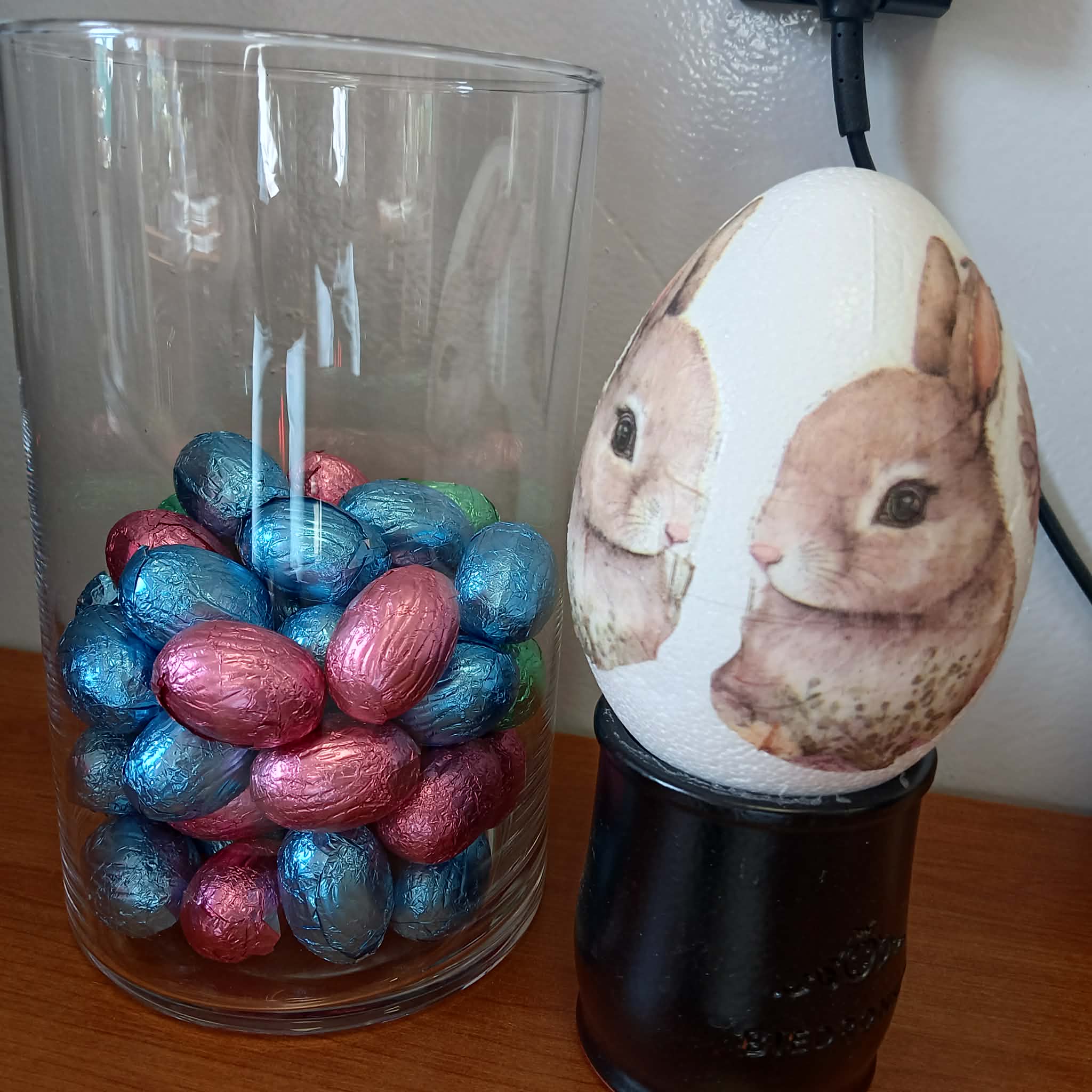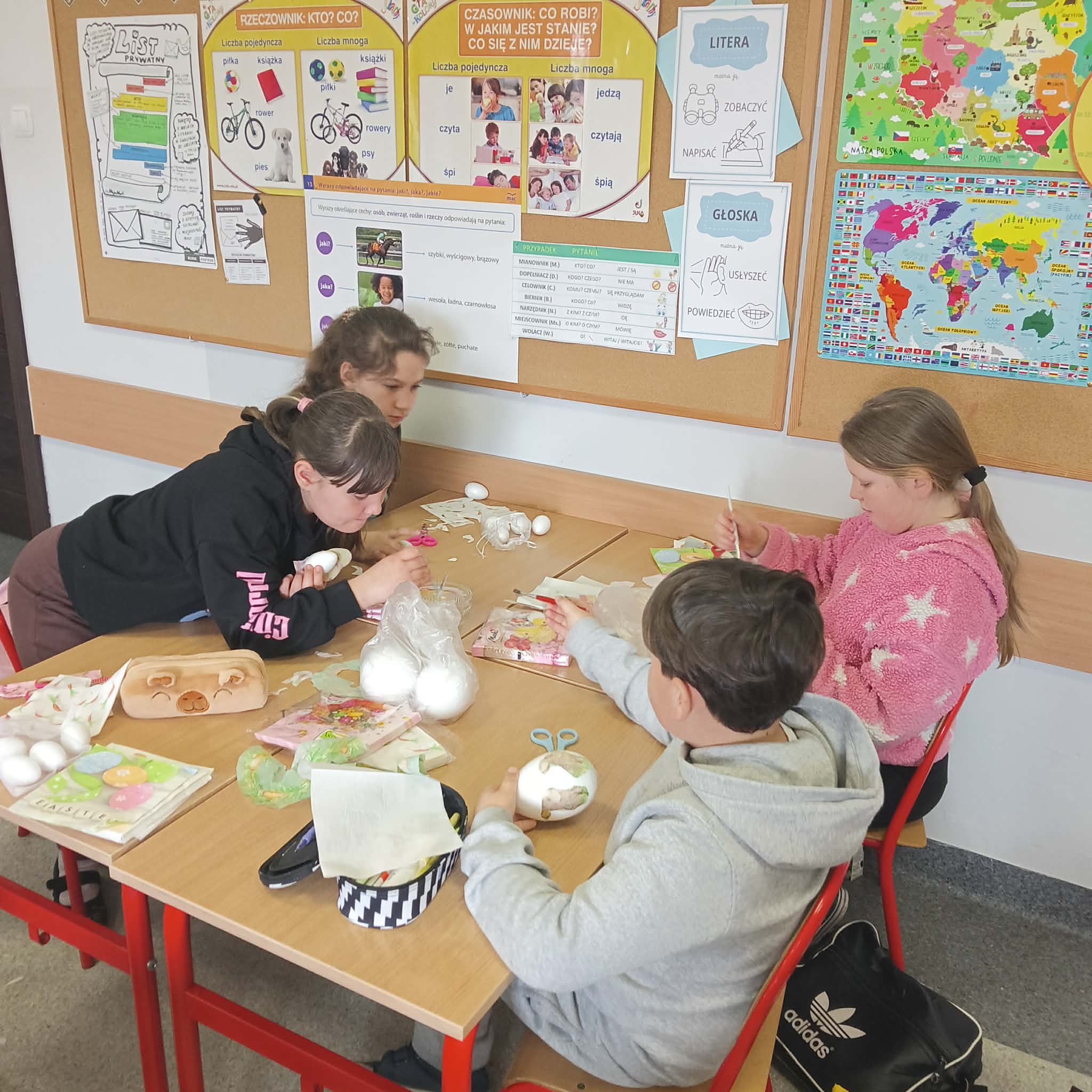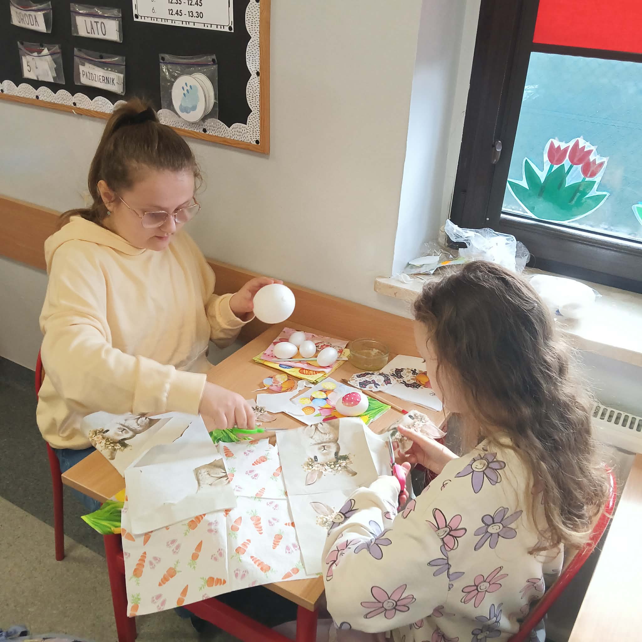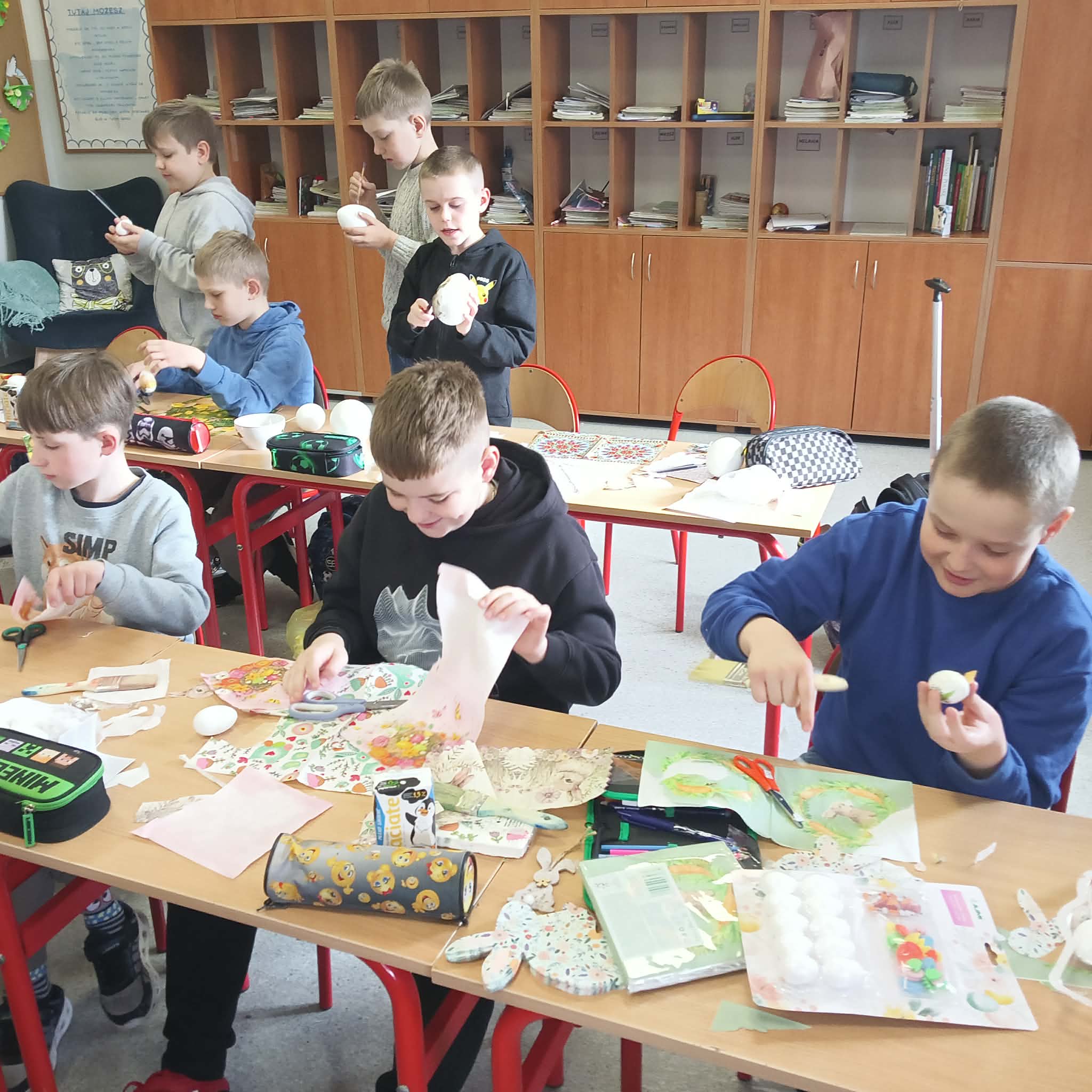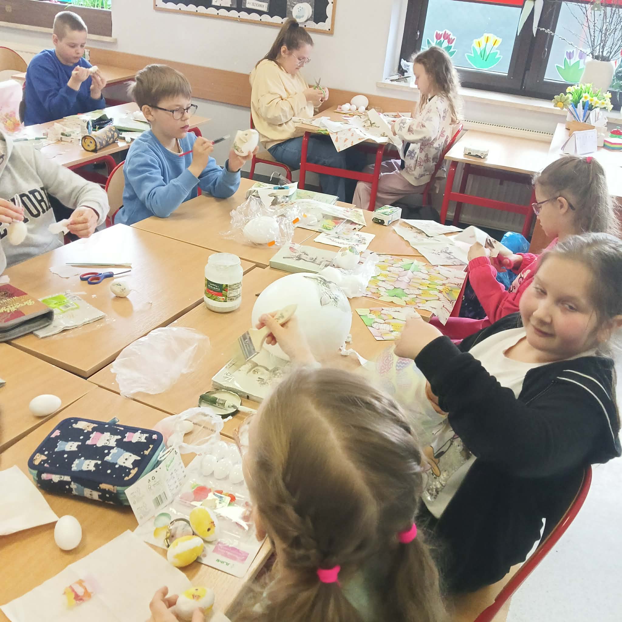 W klasie 3c odbyły się zajęcia kreatywne, podczas których uczniowie wykonywali pisanki wielkanocne techniką decoupage. Dzieci z dużym zaangażowaniem wybierały serwetki, komponowały wzory i starannie ozdabiały swoje jajka. Technika decoupage bardzo przypadła im do gustu — uczniowie byli dumni z efektów swojej pracy i z entuzjazmem opowiadali, że chcieliby wykorzystać ją również w domu do tworzenia kolejnych pisanek oraz innych ozdób wielkanocnych.